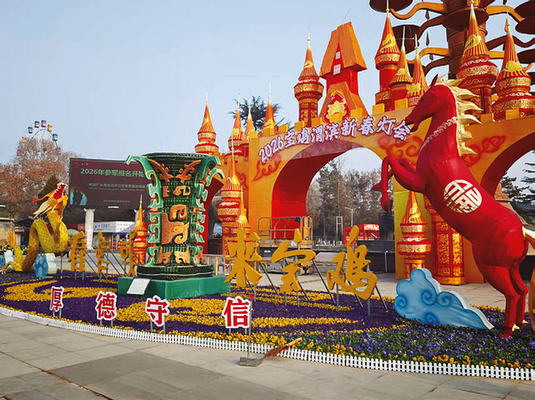 随着马年春节临近,宝鸡人民公园将“马元素”与本土文化相融合,打造出一系列新春亮点。“龙马精神”灯展融入了宝鸡标志性文物何尊元素,兼顾观赏性、文化性与互动性。其中红马寓意红红火火、福气临门,黄龙则寄托着对未来的美好期许,每一组造型都承载着专属的新春祝福。“既能欣赏马年花灯,又能了解何尊文化,我们感受到了浓浓的年味和文化气息。”市民王礼说。
