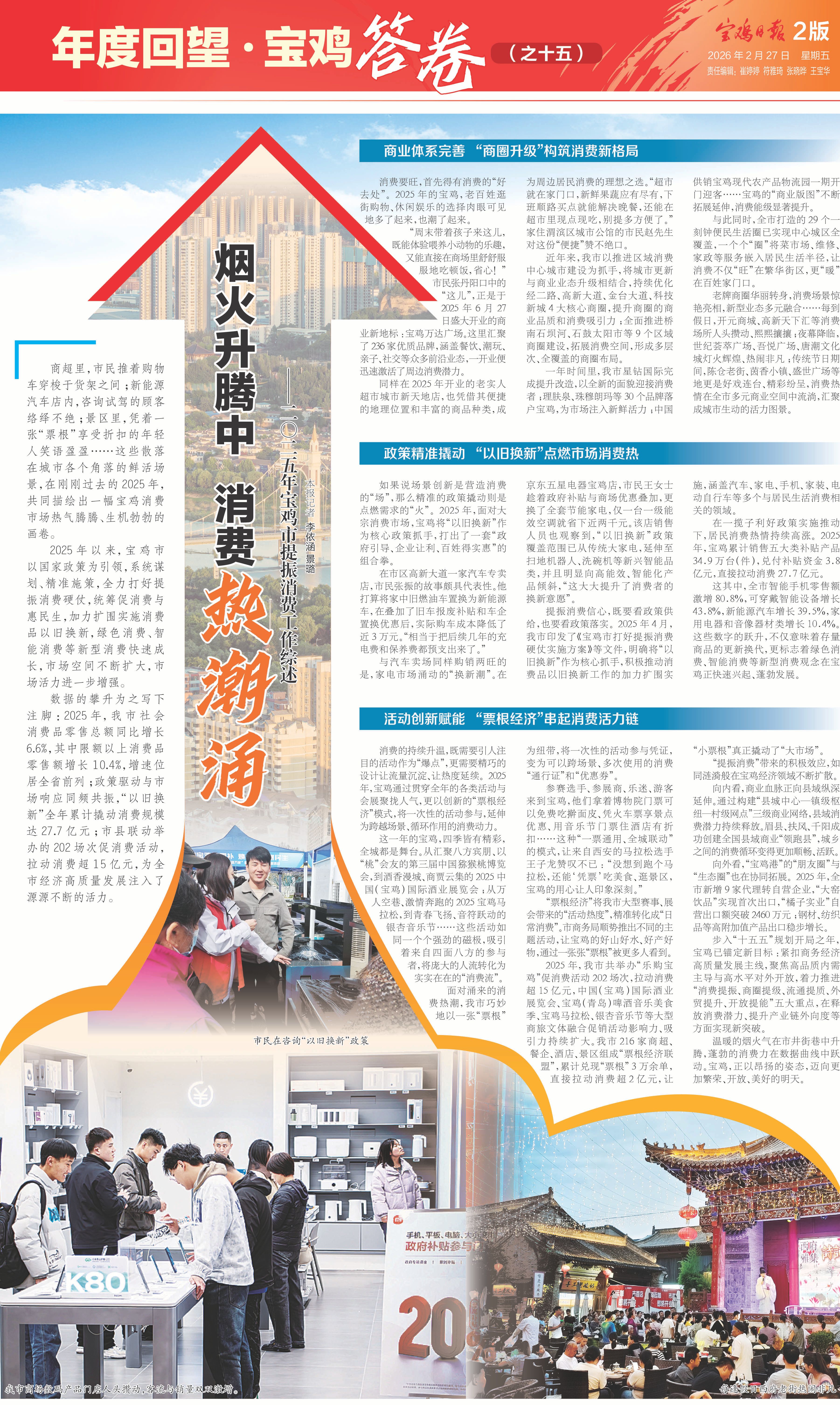 商超里,市民推着购物车穿梭于货架之间;新能源汽车店内,咨询试驾的顾客络绎不绝;景区里,凭着一张“票根”享受折扣的年轻人笑语盈盈……这些散落在城市各个角落的鲜活场景,在刚刚过去的2025年,共同描绘出一幅宝鸡消费市场热气腾腾、生机勃勃的画卷。
