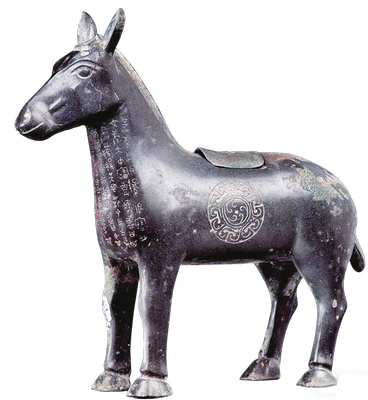 宝鸡出土过大量与马相关的文物,其中的代表就是现藏中国国家博物馆的盠(lí)驹尊。盠驹尊1955年出土于宝鸡眉县李村西周铜器窖藏,通高32.4厘米、长34厘米、重5.68千克,呈昂首站立的马驹造型,竖耳短鬃、垂尾挺胸,是我国已知最早的驹形青铜酒器。