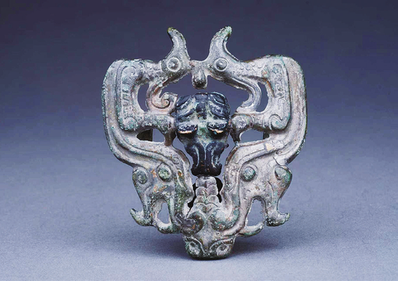 马冠饰是马头顶部的装饰品,钉缀在皮冠上,多为兽面形象。这件马冠饰为透雕铜牌,中脊有两个相背的兽面,两侧为对称的凤鸟,鸟尾又化作夔龙。整体造型独特、结构精巧,反映出器物主人具有较高的身份地位。