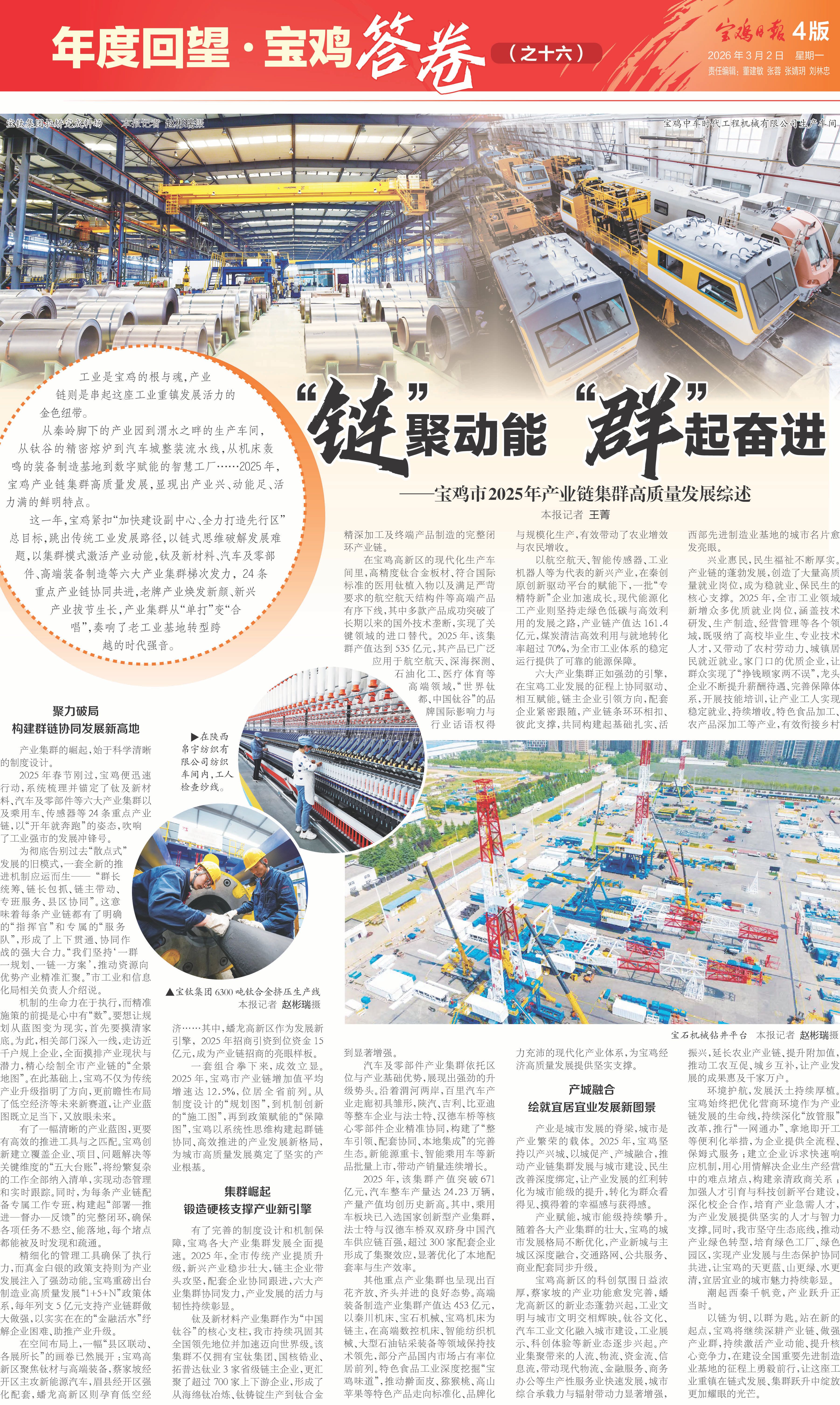 以链为钥、以群为匙。站在新的起点,宝鸡将继续深耕产业链、做强产业群,持续激活产业动能、提升核心竞争力,在建设全国重要先进制造业基地的征程上勇毅前行,让这座工业重镇在链式发展、集群跃升中绽放更加耀眼的光芒。