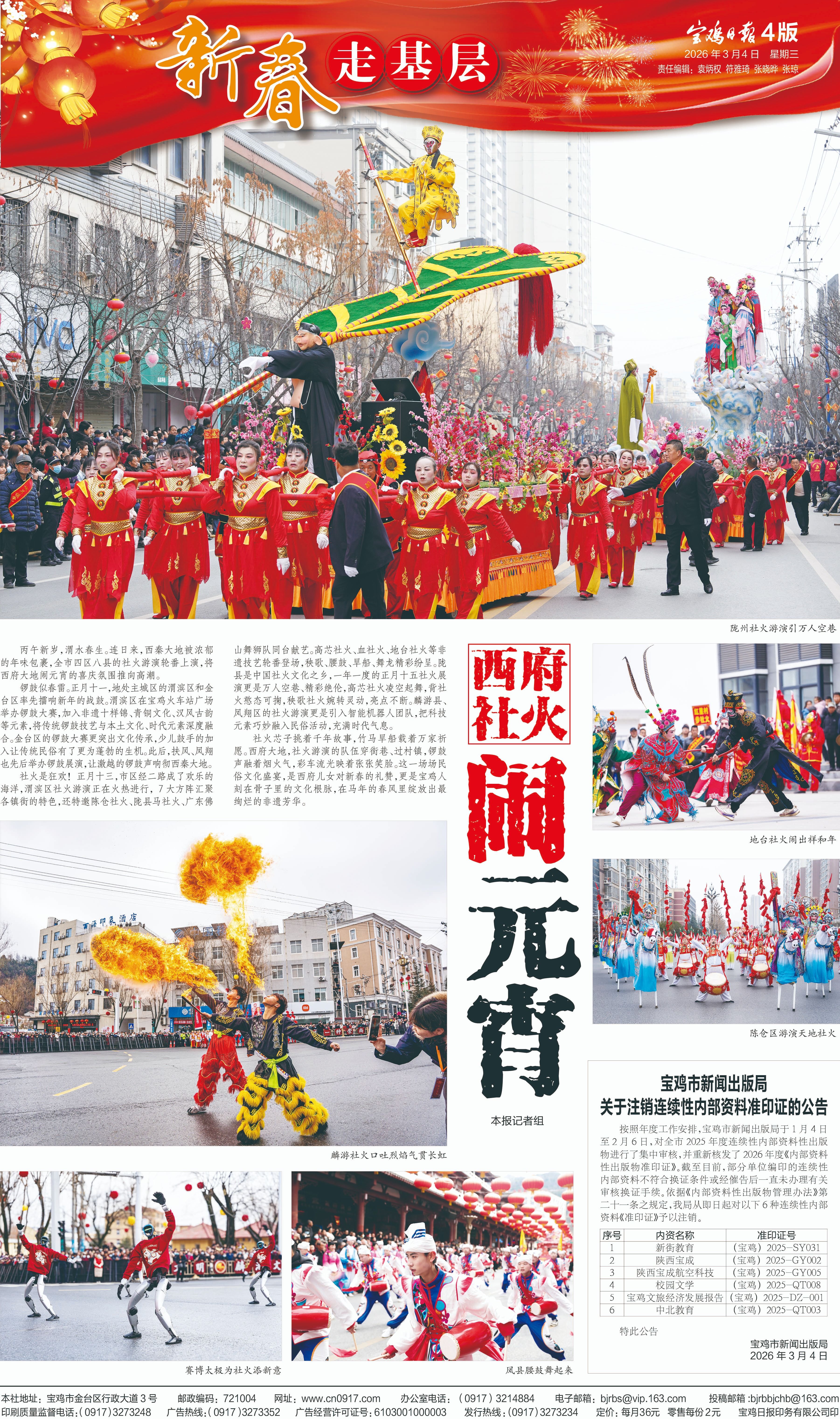 社火芯子挑着千年故事,竹马旱船载着万家祈愿。西府大地,社火游演的队伍穿街巷、过村镇,锣鼓声融着烟火气,彩车流光映着张张笑脸。这一场场民俗文化盛宴,是西府儿女对新春的礼赞,更是宝鸡人刻在骨子里的文化根脉,在马年的春风里绽放出最绚烂的非遗芳华。
