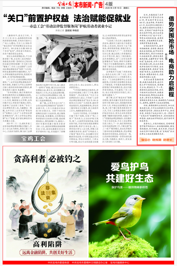 乘势而上,方能行稳致远。宝鸡唯有坚守抢市场的决心、抓机遇的敏锐、强电商的路径,补齐短板、放大优势,才能在全球竞争中持续突围,让“宝鸡造”在全球舞台上绽放更耀眼的光芒。