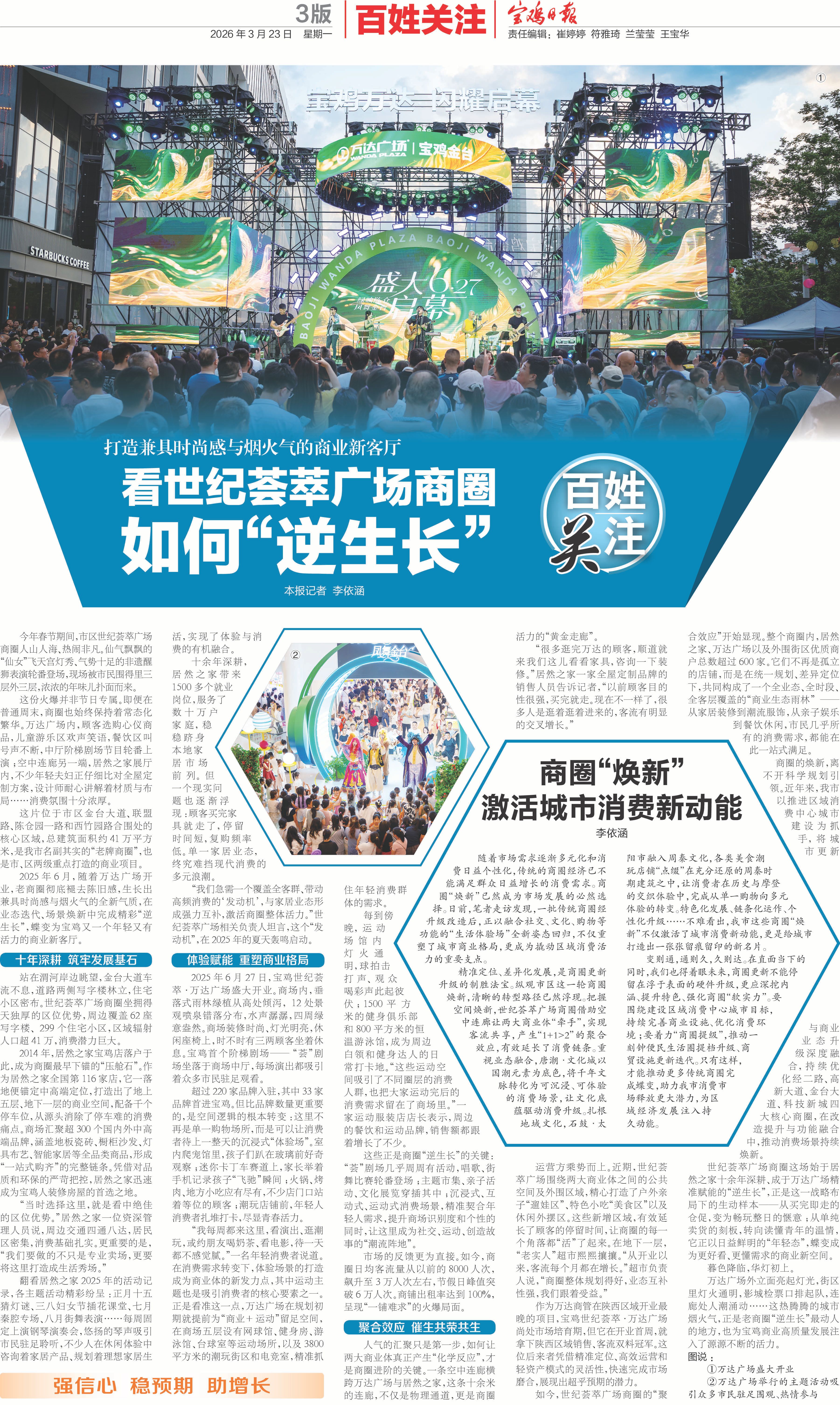 运营方乘势而上。近期,世纪荟萃广场围绕两大商业体之间的公共空间及外围区域,精心打造了户外亲子“遛娃区”、特色小吃“美食区”以及休闲外摆区。这些新增区域,有效延长了顾客的停留时间,让商圈的每一个角落都“活”了起来。在地下一层,“老实人”超市熙熙攘攘。“从开业以来,客流每个月都在增长。”超市负责人说,“商圈整体规划得好,业态互补性强,我们跟着受益。”