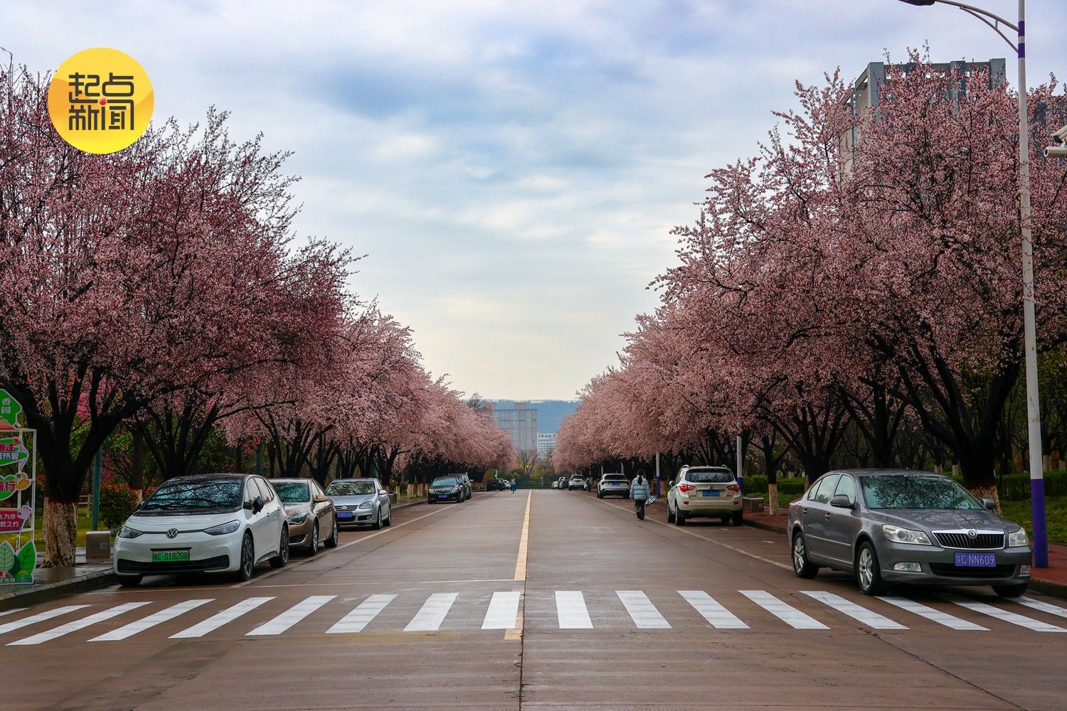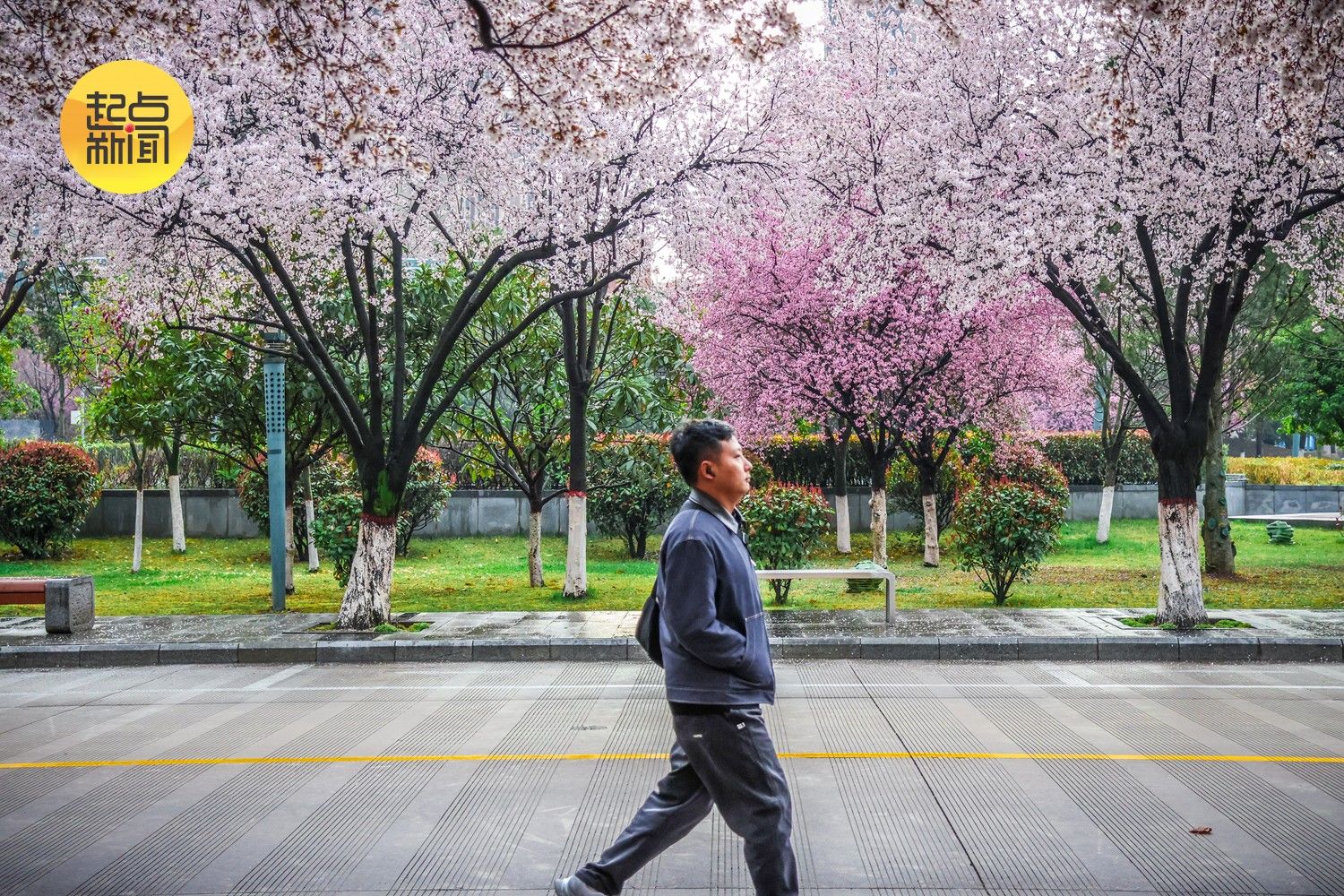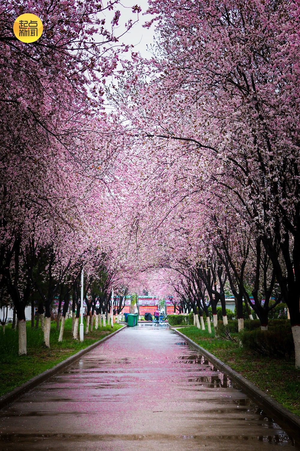 新柳垂丝,繁花盛放,粉黛般的花树沿着道路铺展成浪漫的花廊,落英在湿滑的路面铺成粉色的绒毯。