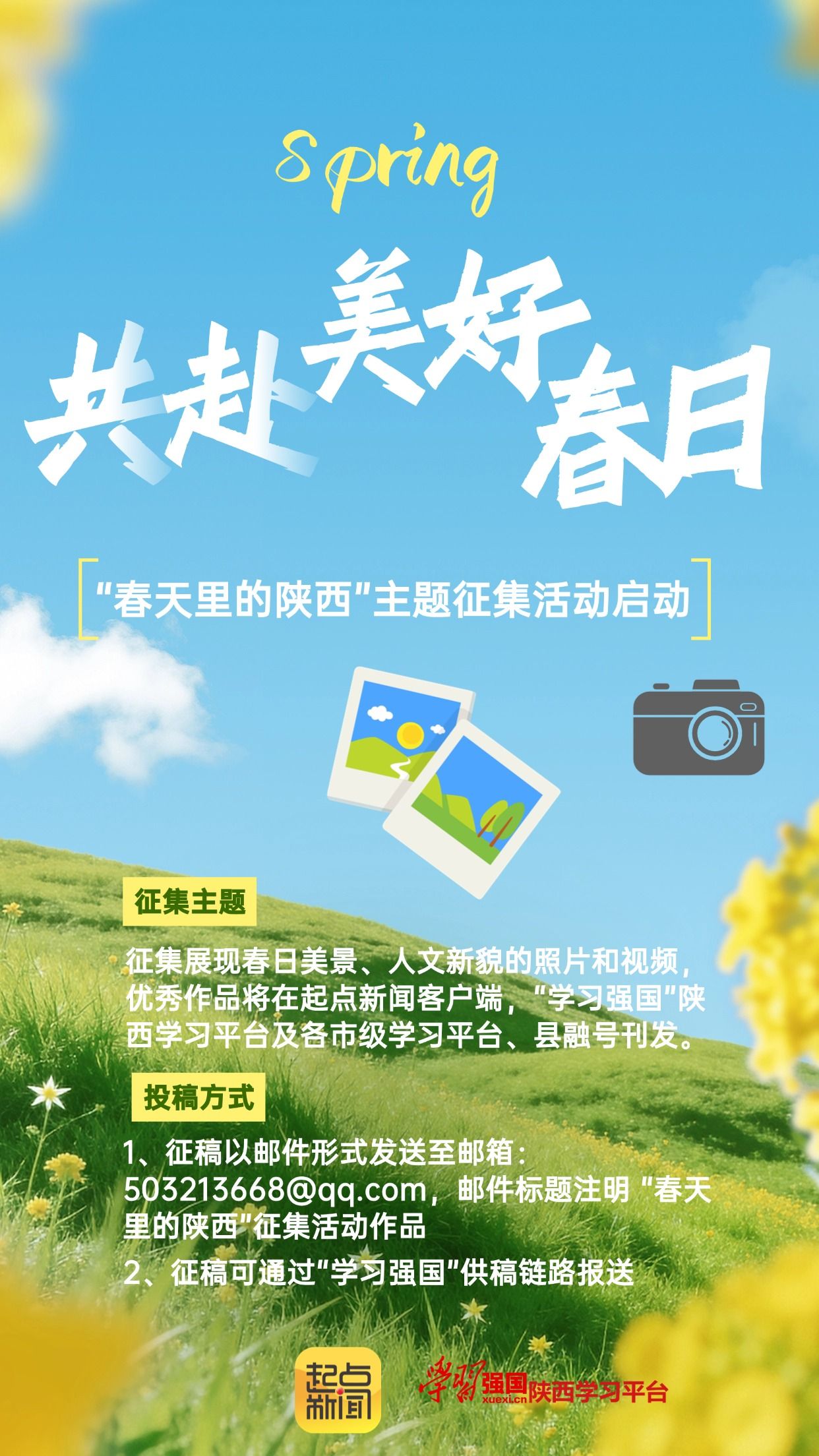 3月10日起,起点新闻、“学习强国”陕西学习平台联合启动 “春天里的陕西”主题征集活动,面向全省各地各高校征集展现春日美景、人文新貌的照片和视频,优秀作品将在起点新闻客户端,“学习强国”陕西学习平台及各市级学习平台、县融号刊发。
