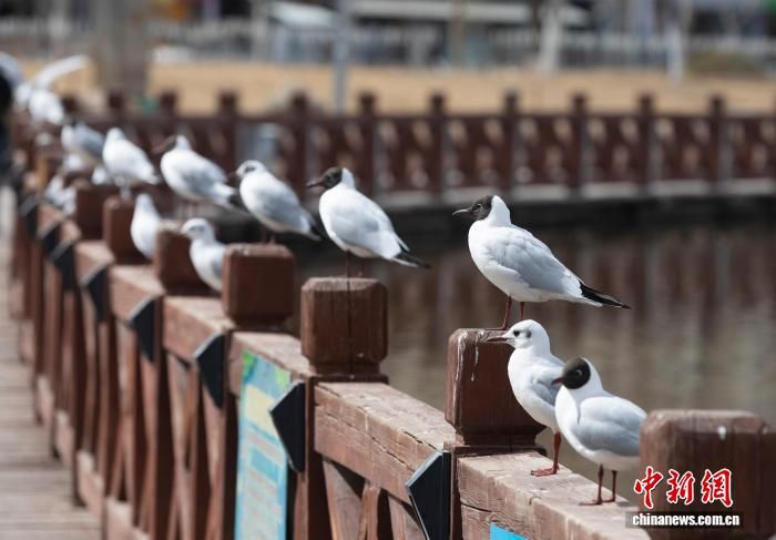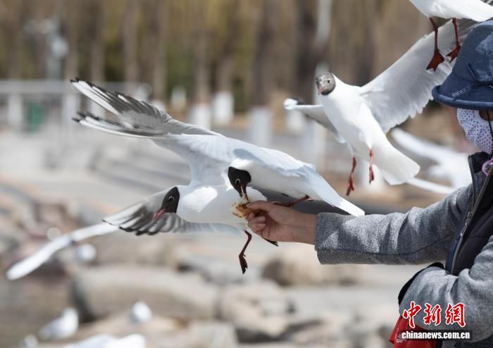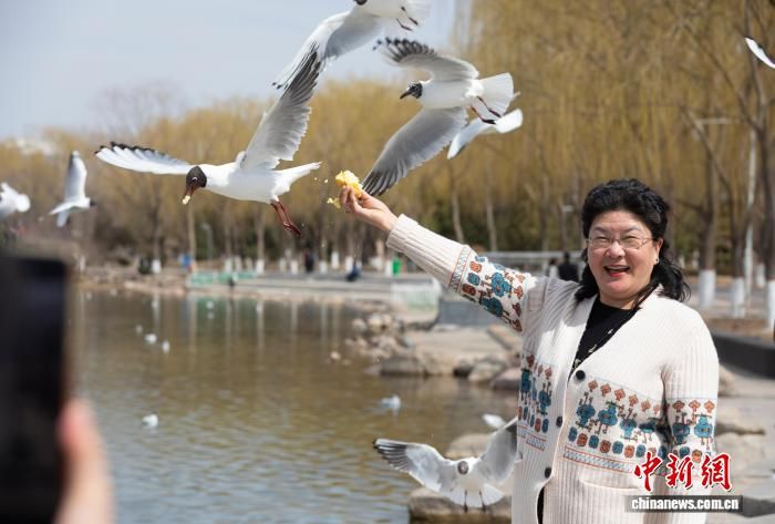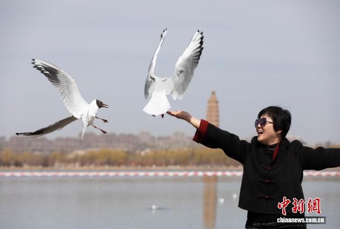 宁夏银川北塔湖边,市民与红嘴鸥等候鸟一同拍照“打卡”。