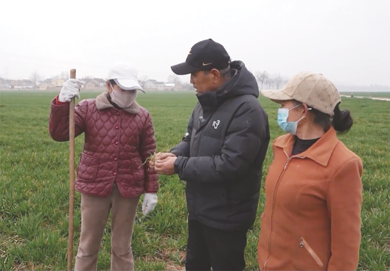 技术员(中)在田间查看苗情。(资料图)