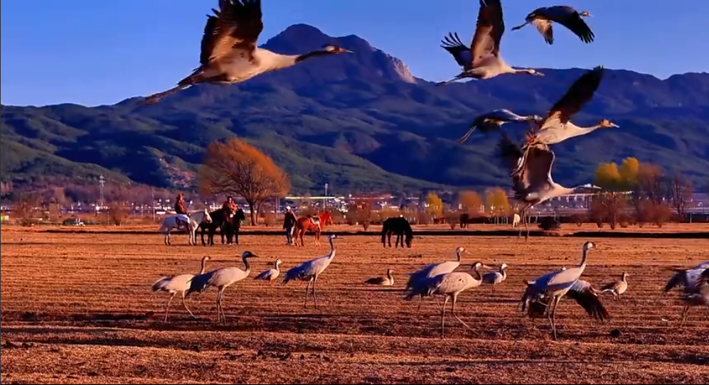 黄昏浸染云南丽江拉市海,湖面泛着温柔的金光,候鸟成群飞舞,一派宁静诗意的高原湿地风光。