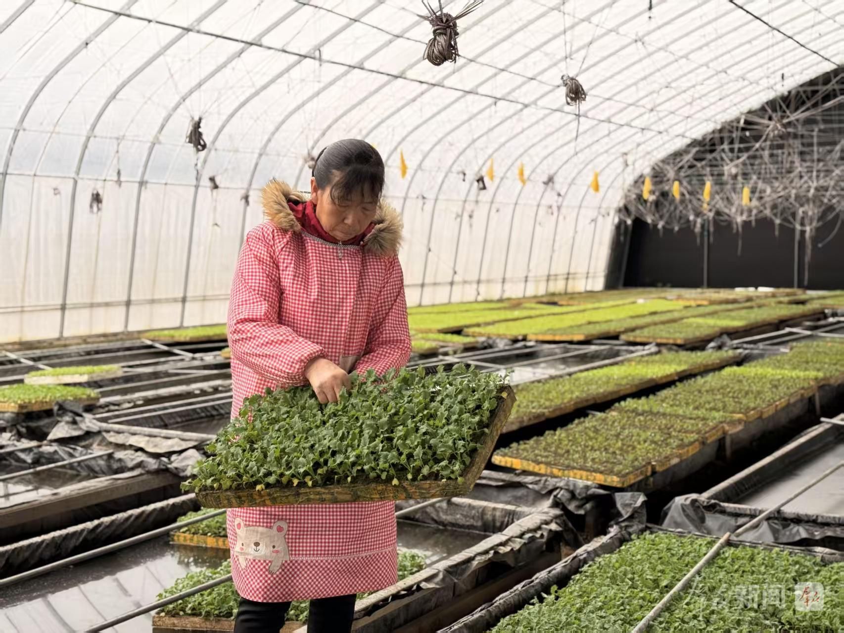 3月25日,太白县绿蕾农业发展有限公司的大棚内,王雪爱在摆放育苗穴盘。