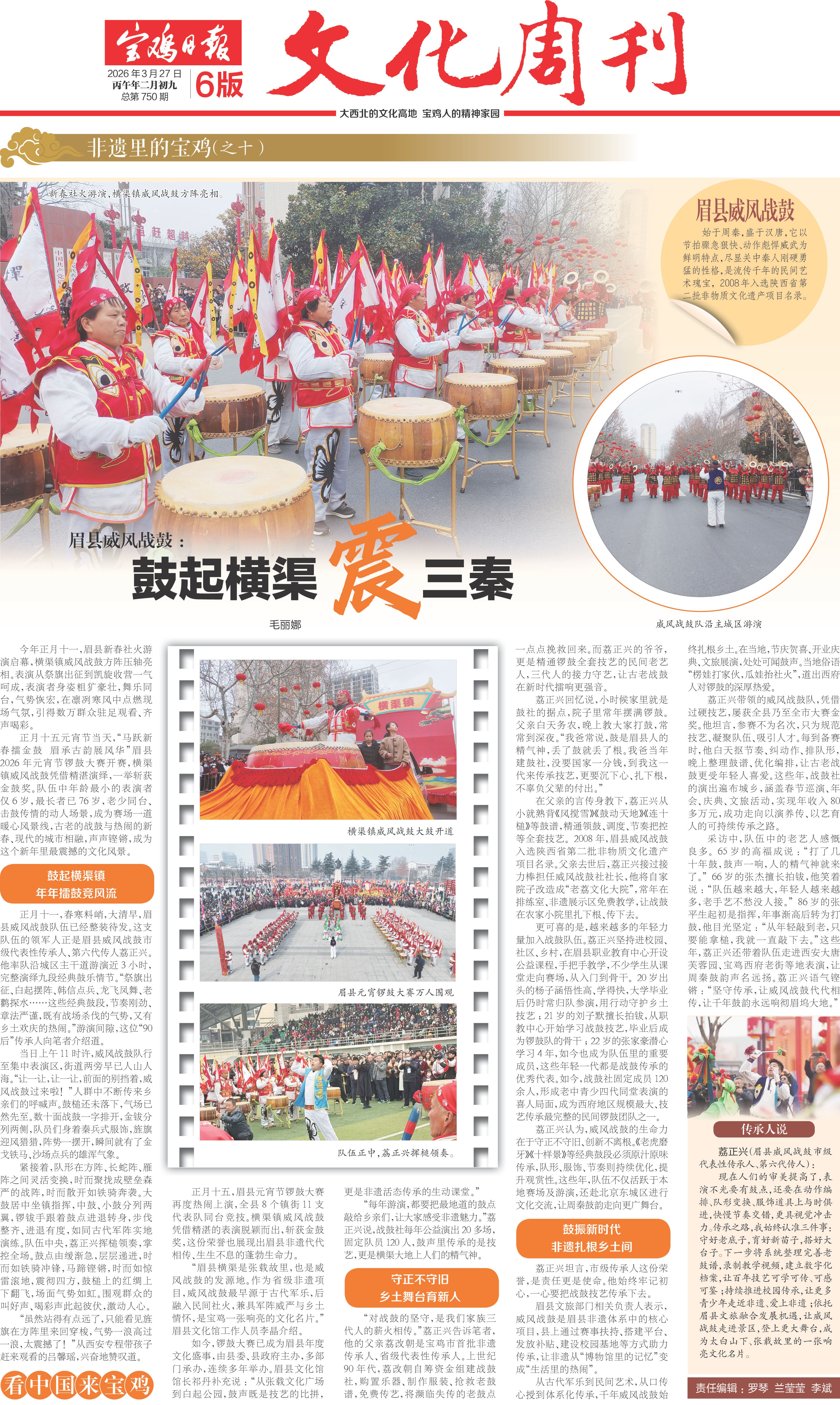 采访中,队伍中的老艺人感慨良多。65岁的高福成说:“打了几十年鼓,鼓声一响,人的精气神就来了。”66岁的张杰擅长拍钹,他笑着说:“队伍越来越大,年轻人越来越多,老手艺不愁没人接。”86岁的张平生起初是指挥,年事渐高后转为打鼓,他目光坚定:“从年轻敲到老,只要能拿槌,我就一直敲下去。”这些年,荔正兴还带着队伍走进西安大唐芙蓉园、宝鸡西府老街等地表演,让周秦鼓韵声名远扬。荔正兴语气铿锵:“坚守传承,让威风战鼓代代相传,让千年鼓韵永远响彻眉坞大地。”