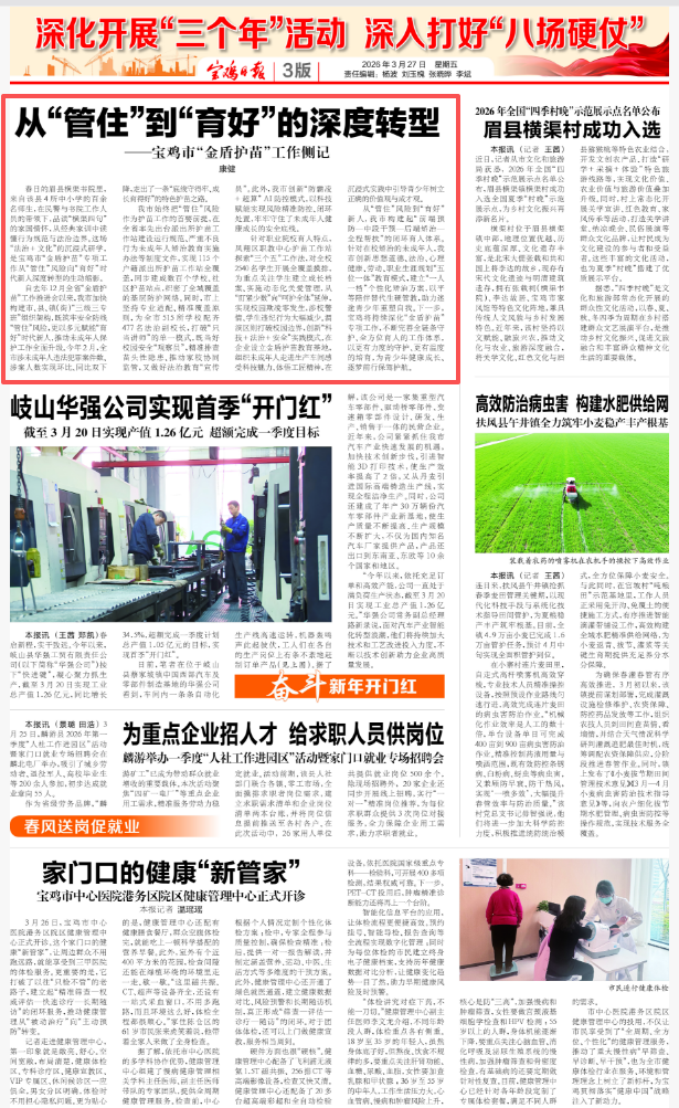 从“管住”风险到“育好”新人,我市构建起“前端预防—中段干预—后端矫治—全程帮扶”的闭环育人体系。针对在校矫治的未成年人,我市创新思想道德、法治、心理健康、劳动、职业生涯规划“五位一体”教育模式,建立“一人一档”个性化矫治方案,以平等陪伴替代生硬管教,助力迷途青少年重塑自我。下一步,宝鸡将持续深化“金盾护苗”专项工作,不断完善全链条守护、全方位育人的工作体系,以更有力度的守护、更有温度的培育,为青少年健康成长、逐梦前行保驾护航。