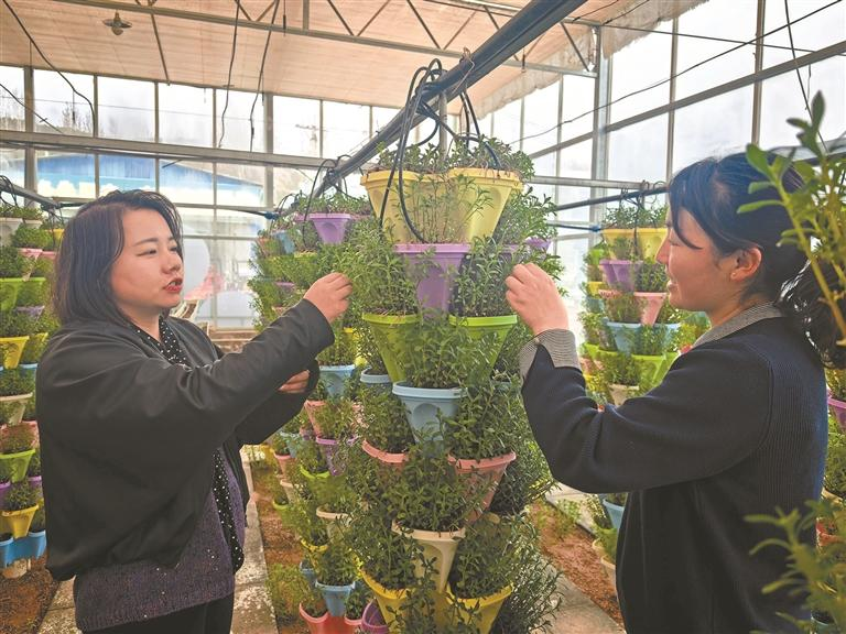 三月二十五日,陇县欣绿蔬菜专业合作社的田七种植大棚内,赵宇洁(左)与技术员查看作物长势。