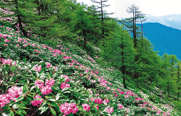 每年5月,山间寒意尚未完全褪去,太白杜鹃、秀雅杜鹃、密枝杜鹃、金背杜鹃便次第登场,将花期延续至8月,把太白山化身花的海洋。不同海拔的山峦间,杜鹃各展风姿,密枝杜鹃枝条短,或匍匐如葡萄藤,或簇生如翠色团绒,与香柏相伴,在高山织就低矮而坚韧的植被景观;在海拔2300米至2900米的山坡上,秀雅杜鹃凭借极强的根蘖能力,在母株四周生发出稠密连片的幼树,紫蓝色的花朵盛开,远远望去如云似霞;生长在海拔3200米至3350米阴坡、半阴坡的金背杜鹃最为珍奇,它们扎根于土层瘠薄的古石河、石海之间,红色与白色的花朵点缀其间,在苍茫高山背景下分外夺目,尽显生命韧性。