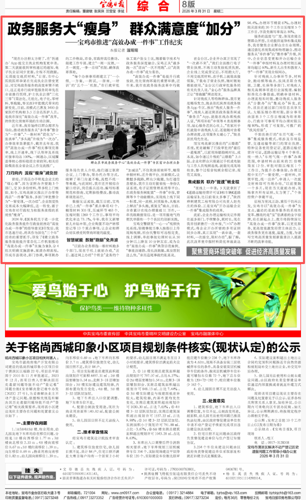 数据见证成效。截至目前,宝鸡市已上线“一件事”重点事项42个,精简材料305项、压减环节463个、压缩时限1260个工作日,事项平均优化率达73.1%。今年,我市又新增育儿补贴申领、企业购置不动产转移登记等13个重点事项,让企业和群众切实感受到营商环境的温度。