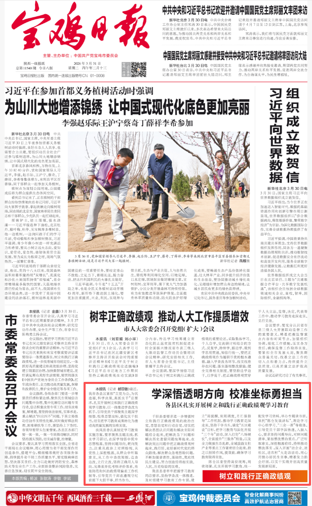 (宝鸡融媒 都亚敏)最近,我市各县区紧扣“立党为公、为民造福、科学决策、真抓实干”总要求,扎实开展树立和践行正确政绩观学习教育,以一体推进学查改为抓手,引导党员干部聚焦主题深学细悟,校准思想坐标、强化实干担当,切实把学习教育成果转化为推动高质量发展的实绩实效。