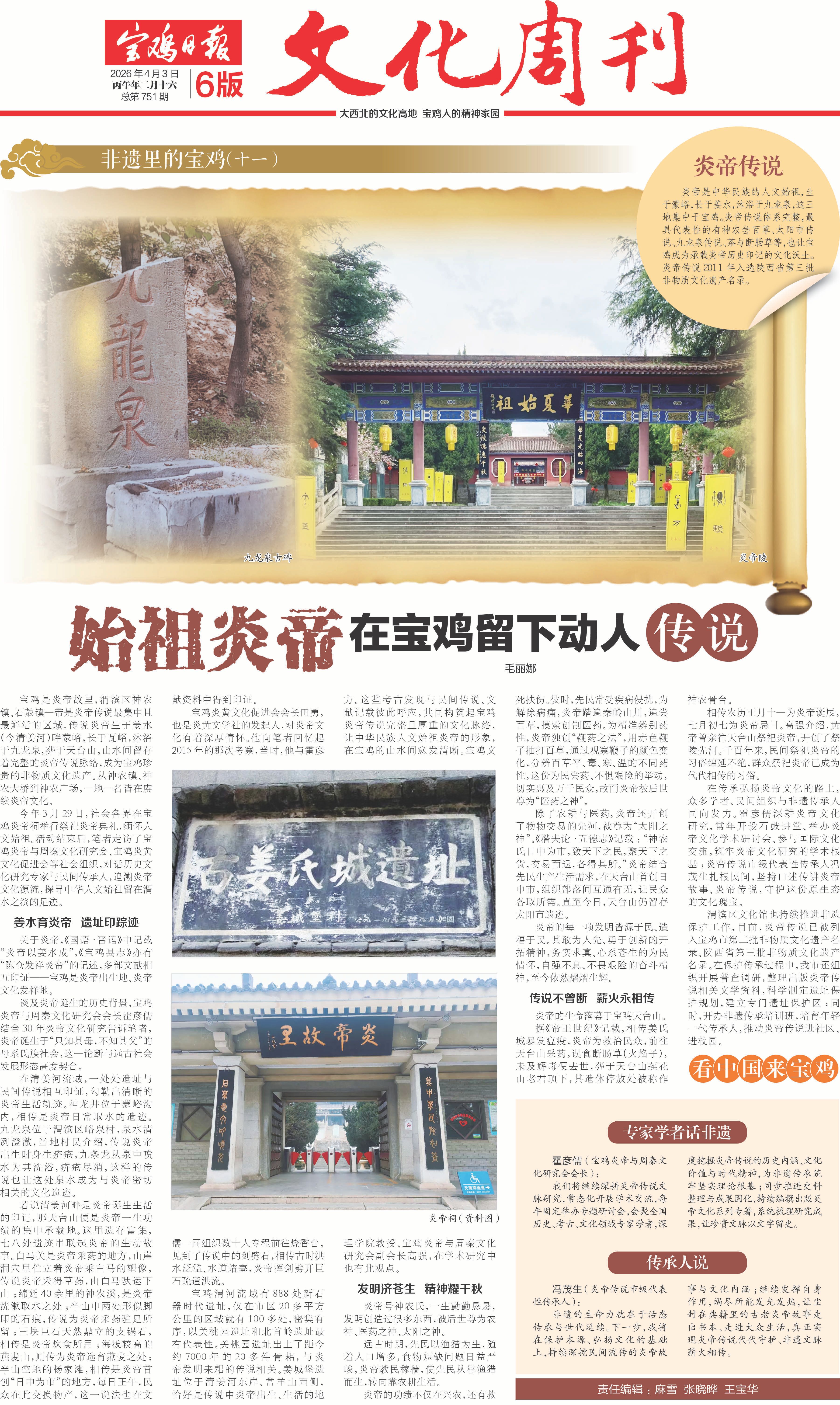 关于炎帝,《国语·晋语》中记载“炎帝以姜水成”,《宝鸡县志》亦有“陈仓发祥炎帝”的记述,多部文献相互印证——宝鸡是炎帝出生地、炎帝文化发祥地。