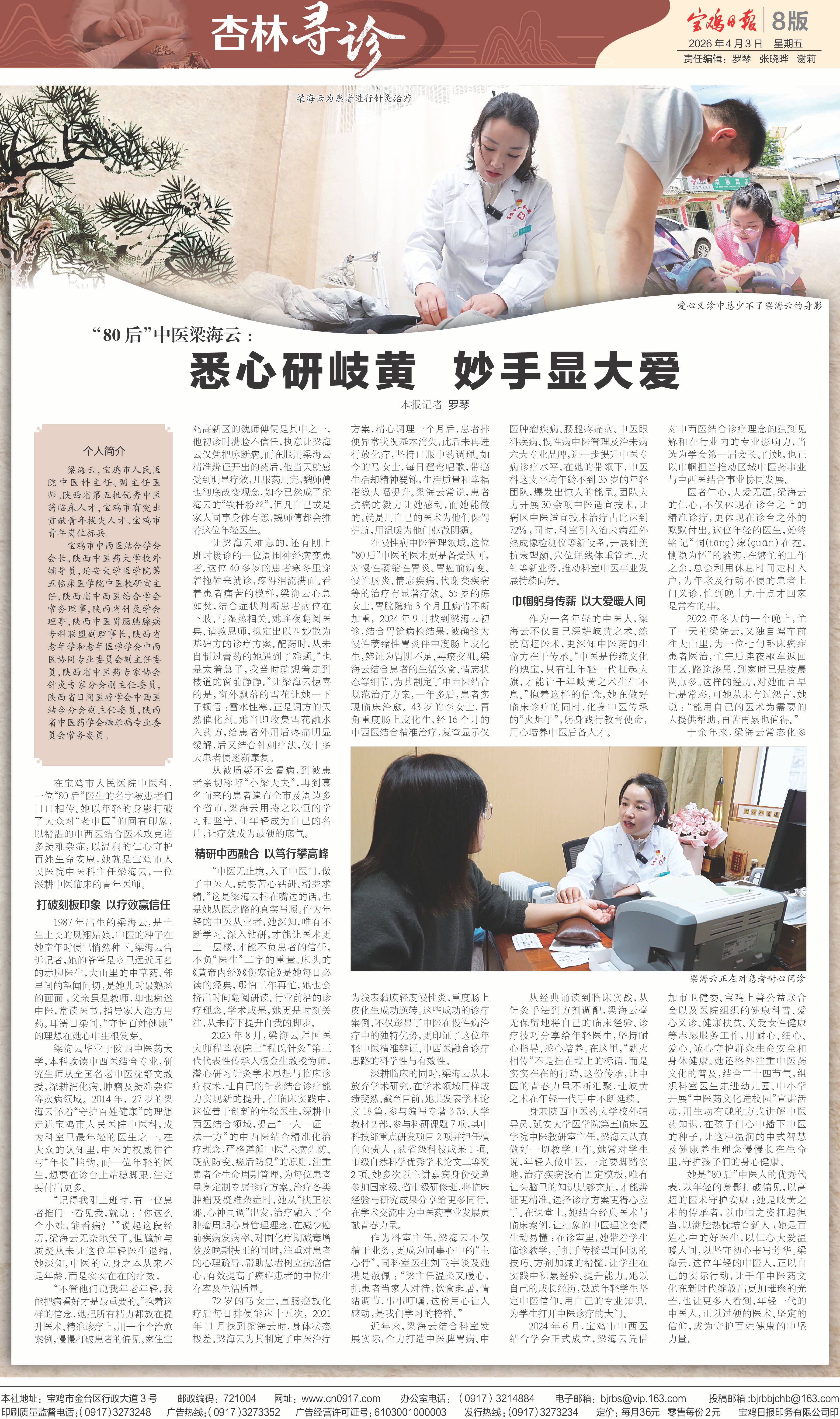 1987年出生的梁海云,是土生土长的凤翔姑娘,中医的种子在她童年时便已悄然种下。梁海云告诉记者,她的爷爷是乡里远近闻名的赤脚医生,大山里的中草药、邻里间的望闻问切,是她儿时最熟悉的画面;父亲虽是教师,却也痴迷中医,常读医书,指导家人选方用药。耳濡目染间,“守护百姓健康”的理想在她心中生根发芽。