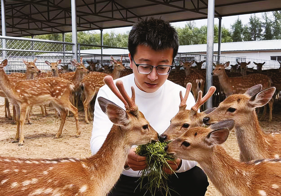 张祎江在梅花鹿养殖基地给幼鹿喂食