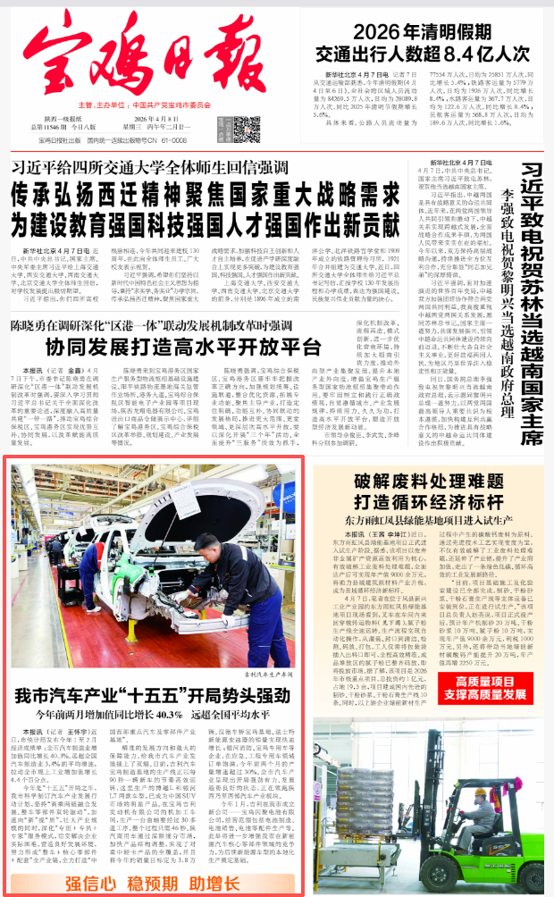 精准的发展方向和强大的保障能力,给我市汽车产业发展插上了双翅。目前,吉利汽车宝鸡制造基地的生产线正以每90秒一辆新车的节奏高效运转,这里生产的博越L和银河L7两款车型,已成为中国SUV市场的明星产品。在宝鸡吉利发动机有限公司的机加工车间,生产一台曲轴要经过30多道工序,整个过程只需46秒。陕汽商用车通过深耕细分市场,加快产品结构调整,实现了对重中轻卡产品的全覆盖,并且将今年的销量目标定为3.8万辆。汉德车桥宝鸡基地、法士特新能源变速器的销量实现快速增长;银河消防、宝鸡专用车等企业,在应急、工程专用车领域订单饱满,今年前两个月的产量增速超过30%。全市汽车产业呈现出开局强劲有力、发展趋势良好的状态,正在领跑陕西乃至西部汽车产业板块。