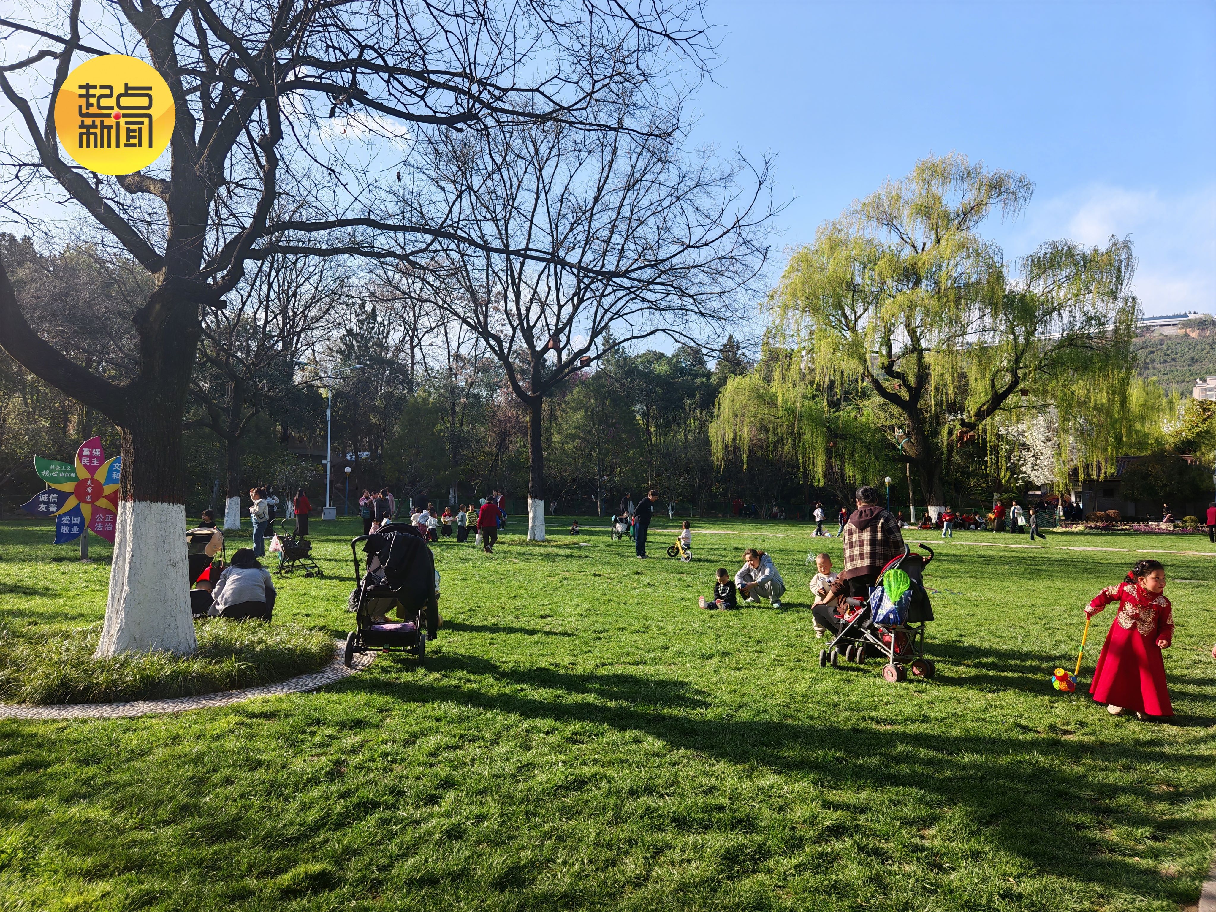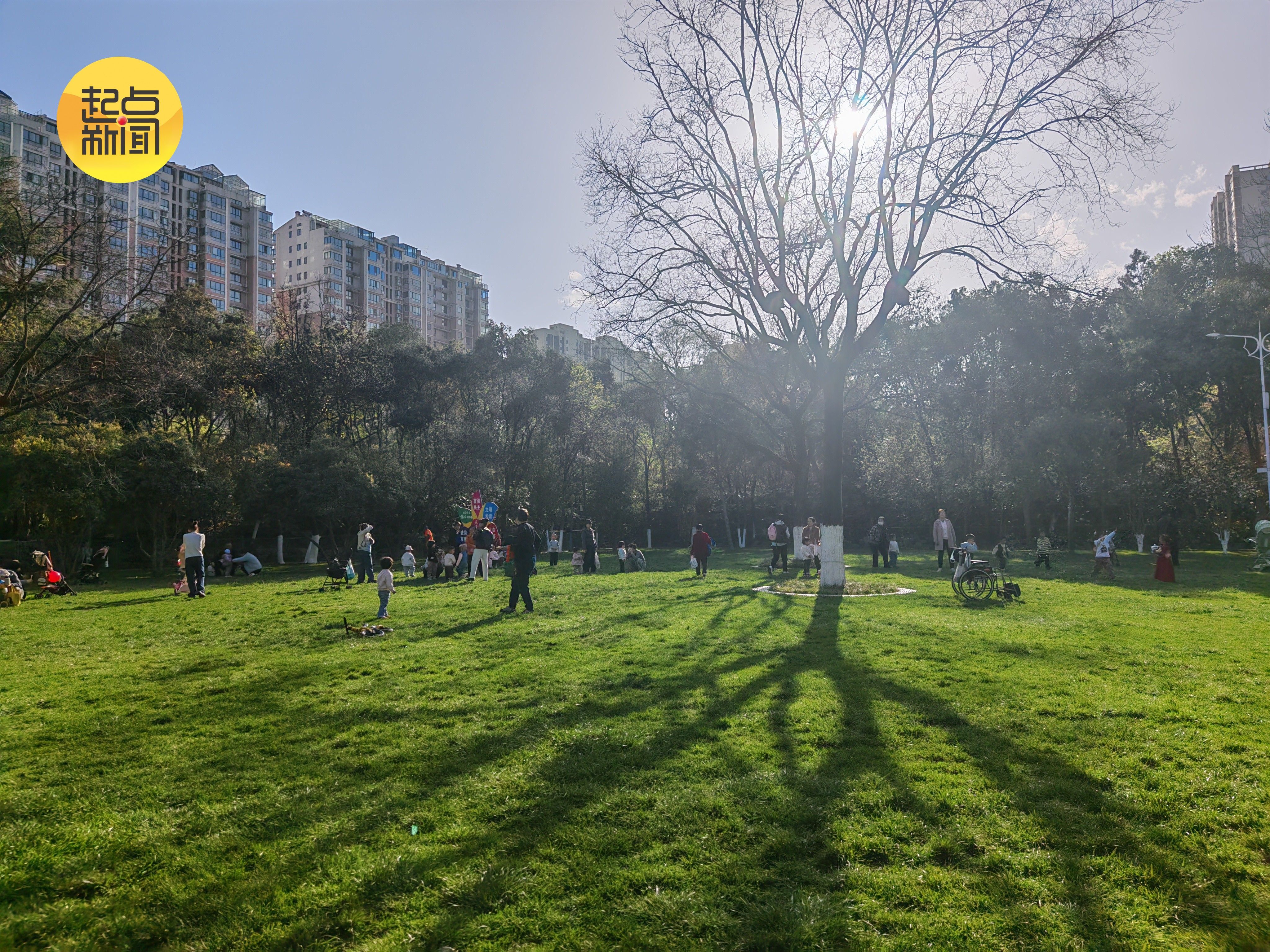 暖阳倾洒草坪,光影斑驳间绿意盎然,人们或静坐休憩、或嬉戏玩闹,尽显悠然自在的春日闲情。
