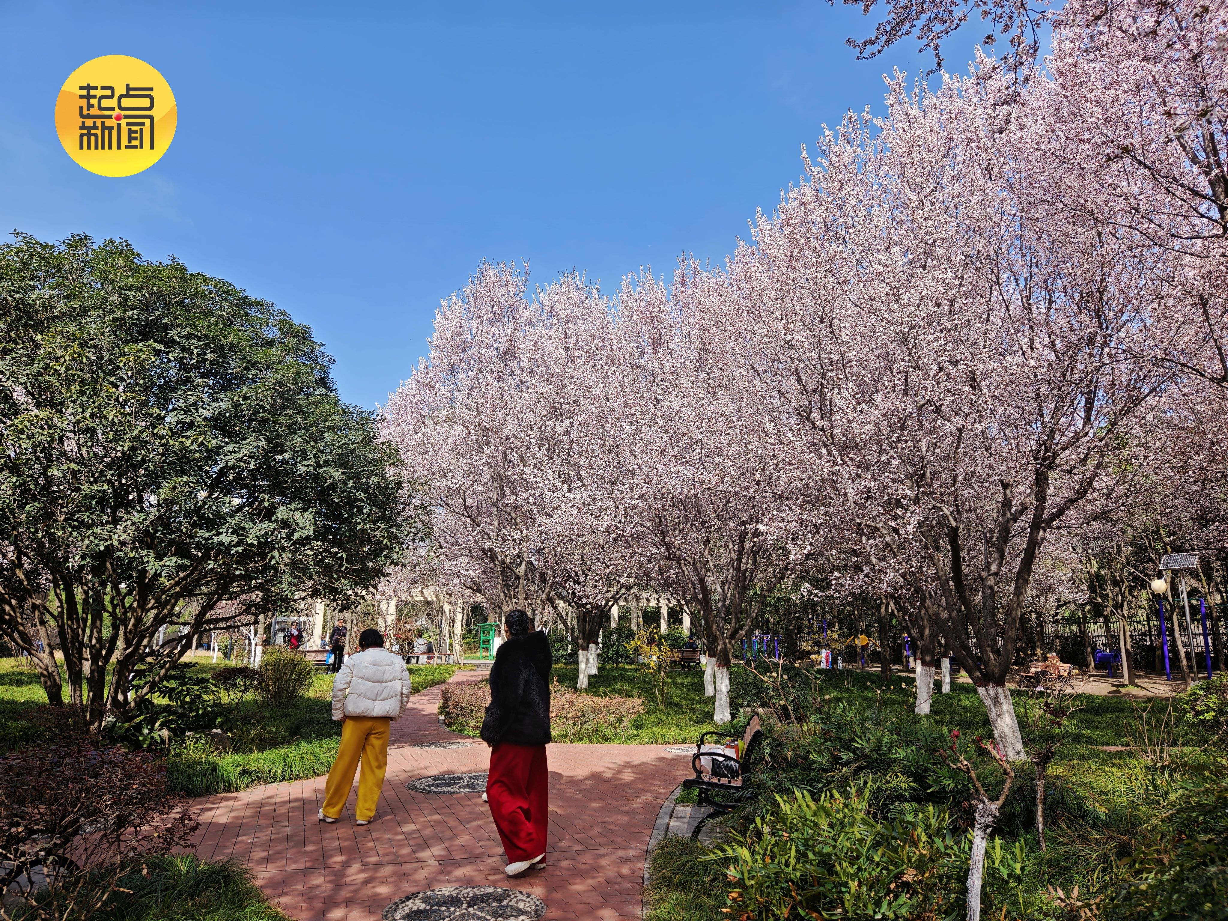 粉白的花树如云似霞,沿步道织就浪漫花廊,游人漫步其间,抬手轻触花枝,定格落英缤纷的春日盛景。