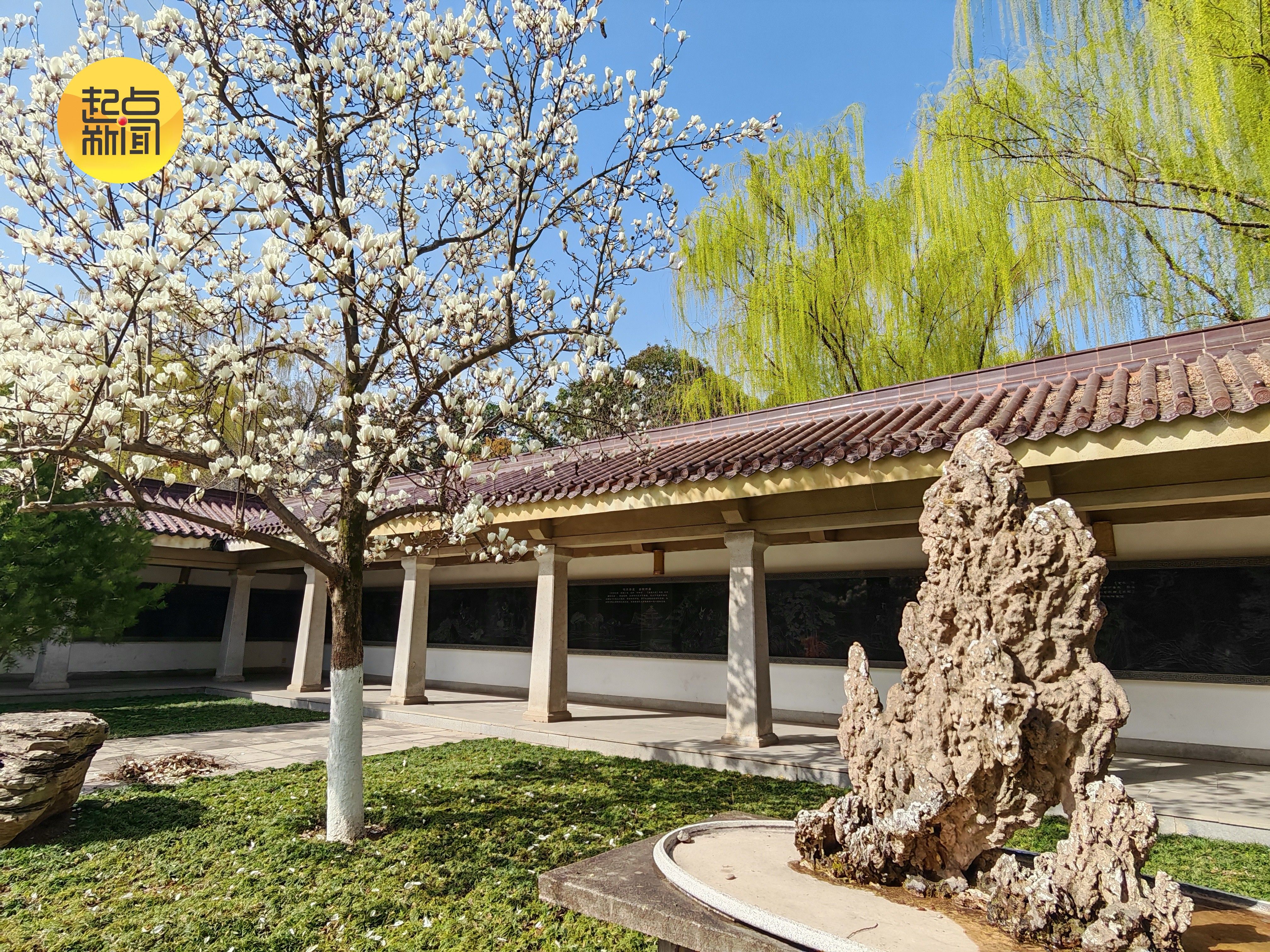 素洁玉兰缀满枝头,花瓣莹润如雪,与青砖长廊、嶙峋奇石相映成趣,勾勒出清雅静谧的春日画卷。