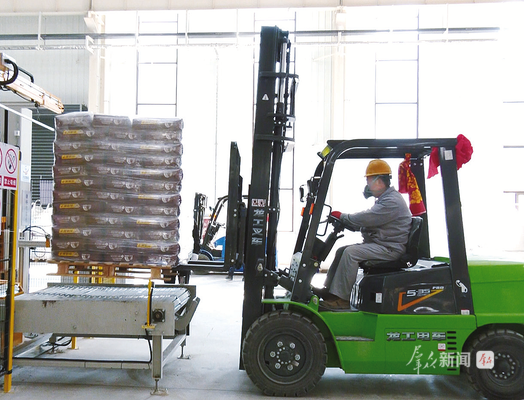 该项目生产流程实现自动化操作,从灌装、封口到清洁、检测、码放、打包,工人仅需将包装袋插入出料口即可,全程高效精准。