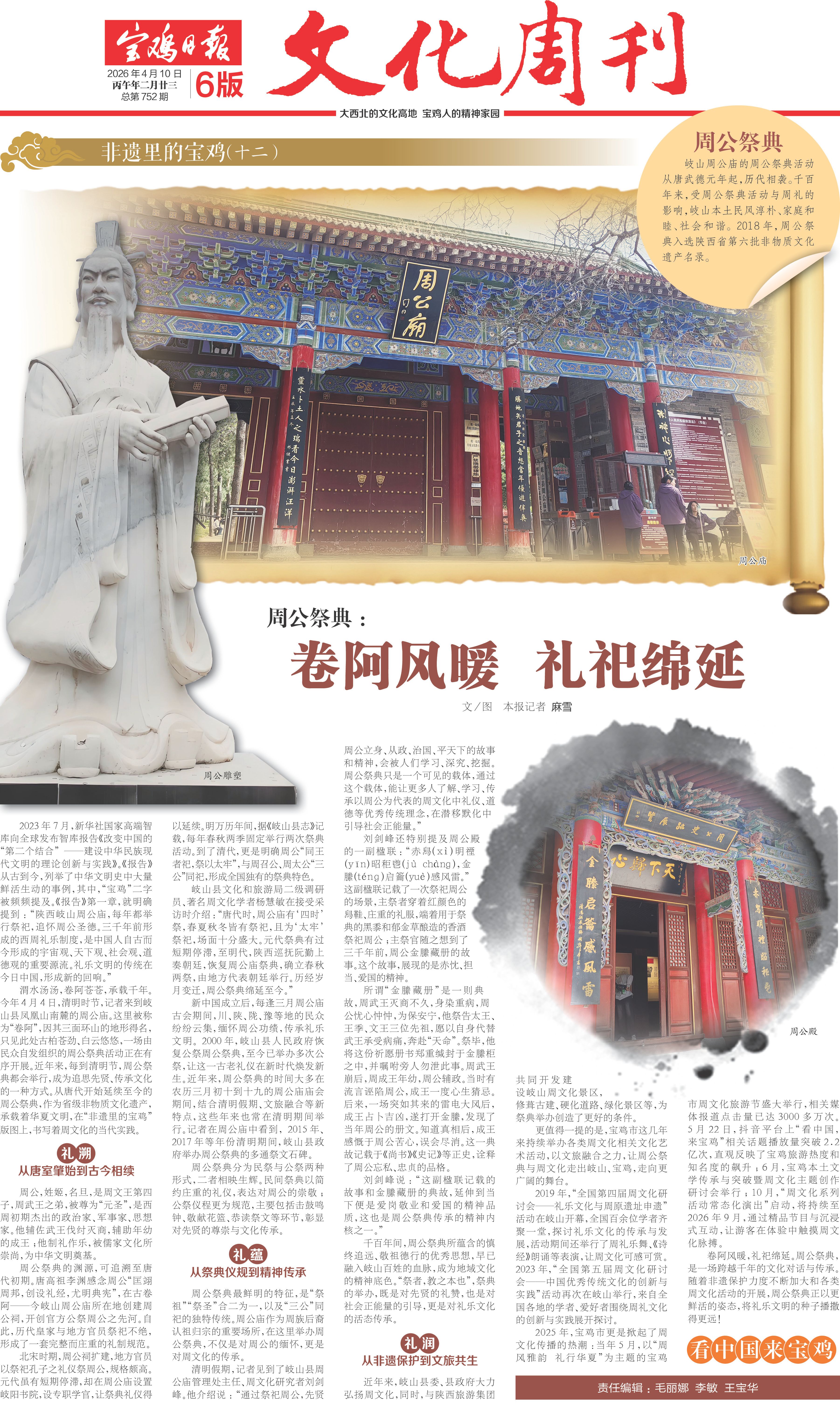 渭水汤汤,卷阿苍苍,承载千年。今年4月4日,清明时节,记者来到岐山县凤凰山南麓的周公庙。这里被称为“卷阿”,因其三面环山的地形得名,只见此处古柏苍劲、白云悠悠,一场由民众自发组织的周公祭典活动正在有序开展。近年来,每到清明节,周公祭典都会举行,成为追思先贤、传承文化的一种方式。从唐代开始延续至今的周公祭典,作为省级非物质文化遗产,承载着华夏文明,在“非遗里的宝鸡”版图上,书写着周文化的当代实践。