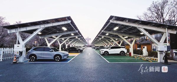 这座充电站位于凤翔区运动休闲广场。站内共设30个充电车位,采用光伏车棚一体化设计,车棚顶上铺满光伏板,既能为车辆遮阳挡雨,又能将阳光转化为清洁电能。
