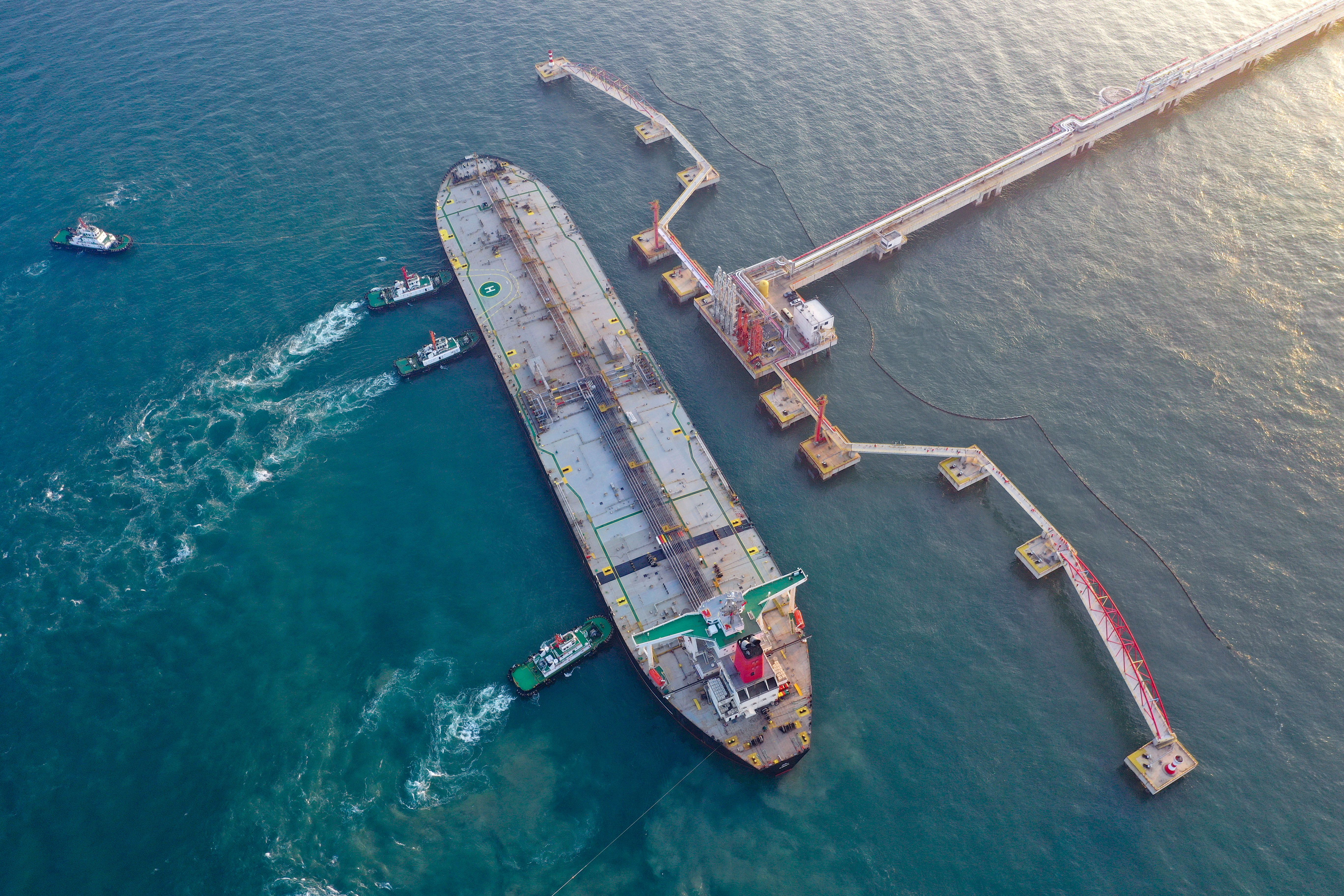 △ 2025年12月18日,一艘装载着17.9万吨石化原辅料的船舶泊入位于海南省儋州市的国投洋浦油储码头30万吨级原油泊位(无人机照片)。