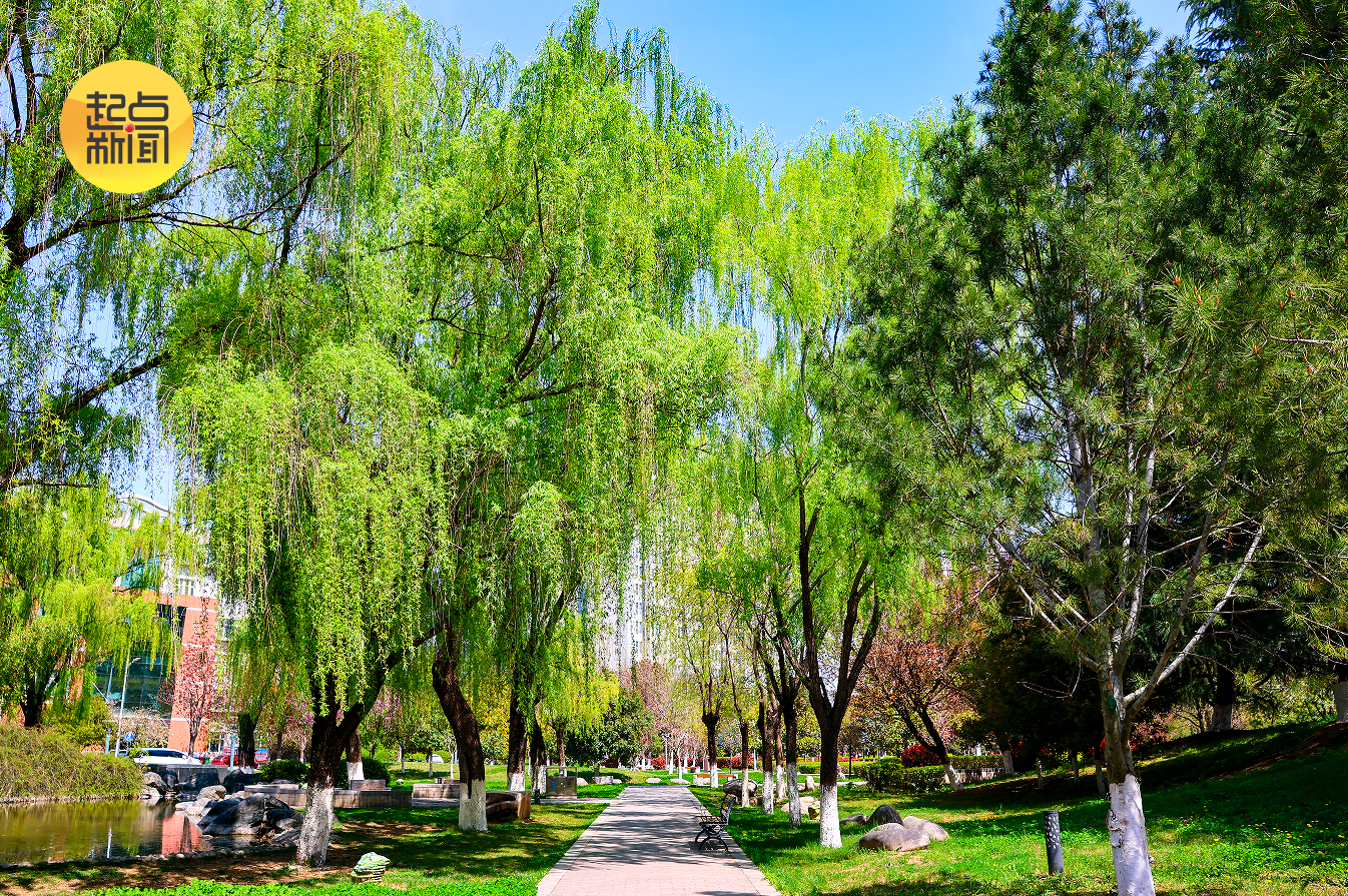 “四为园”旁柳丝依依,湖畔亭台映水天光。