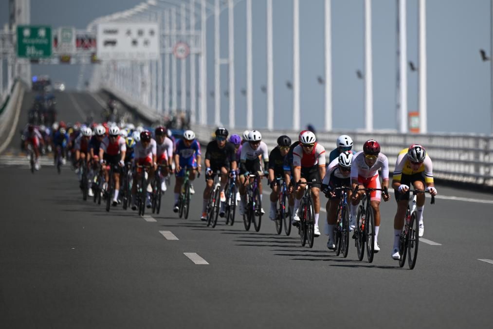 △2025年11月8日,第十五届全国运动会公路自行车男子个人赛决赛开赛。图为参赛选手经过港珠澳大桥。