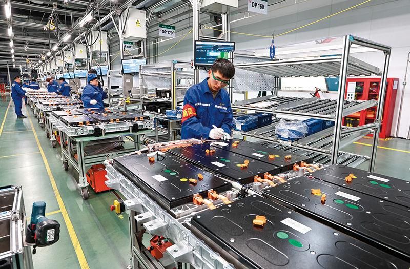 △工人在安装新能源汽车动力电池系统。
