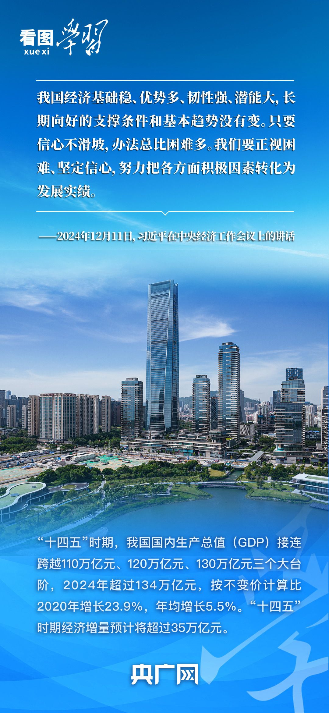 110万亿元、120万亿元、130万亿元……“十四五”期间,我国坚持稳中求进工作总基调,经济总量连续跨越新关口。2025年,中国经济总量预计约140万亿元。习近平总书记曾多次指出,中国经济具有“基础稳、优势多、韧性强、潜能大”的特点,强调要坚持以推动高质量发展为主题,推动经济实现质的有效提升和量的合理增长,为我们持续做好经济工作指明方向。