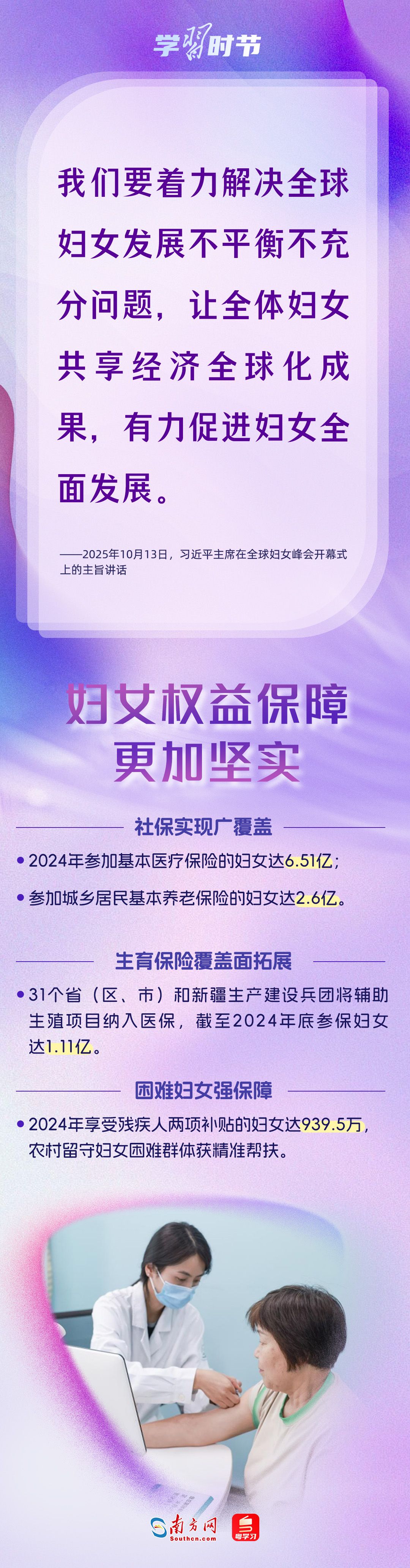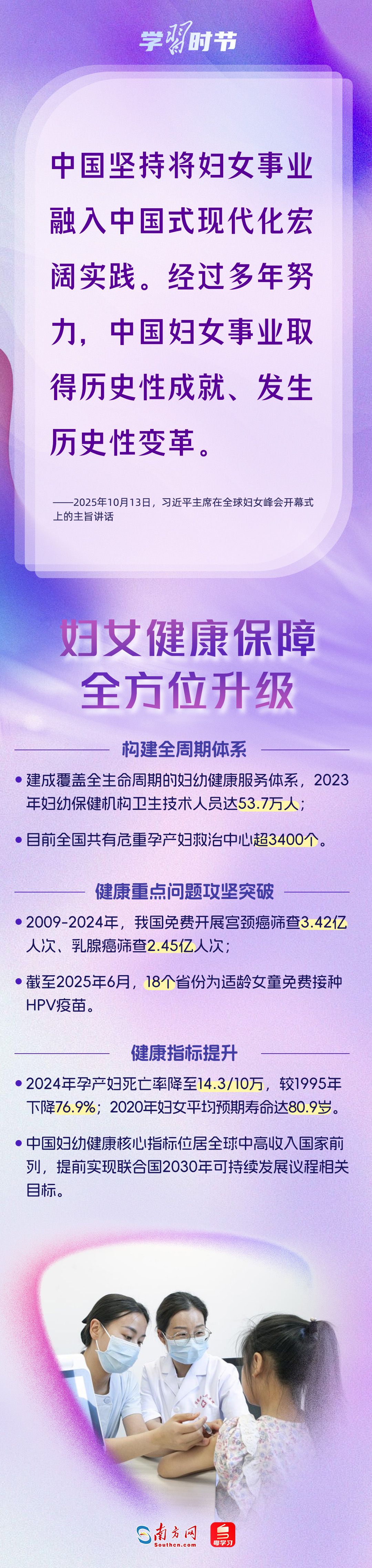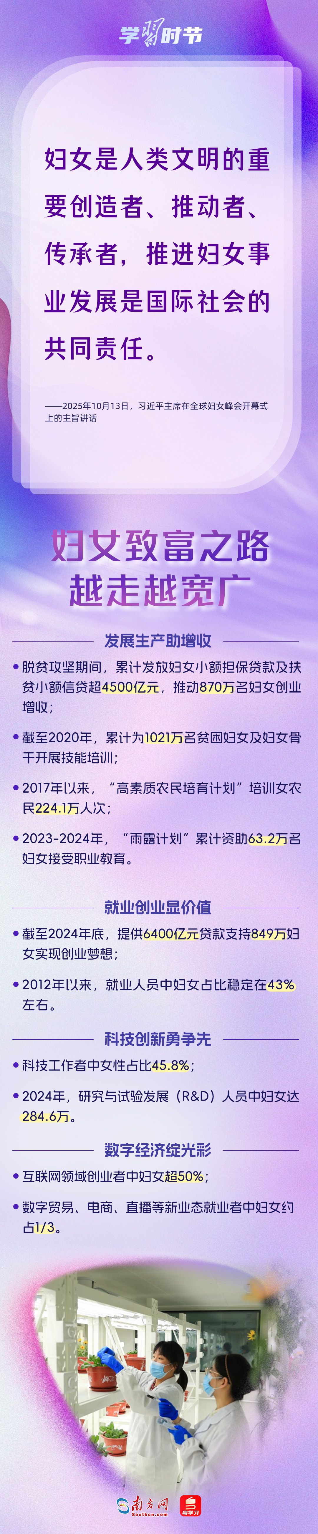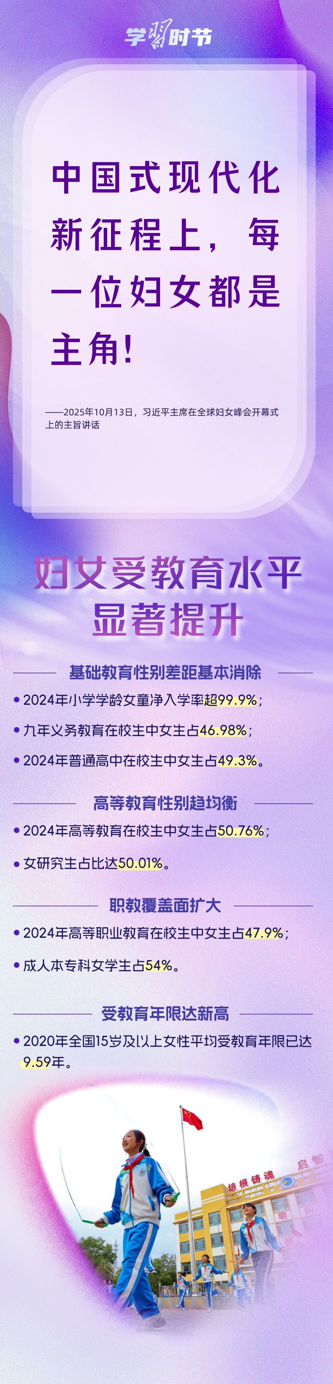 10月13日上午,习近平主席在北京出席全球妇女峰会开幕式并发表主旨讲话。自1995年承办联合国第四次世界妇女大会后,我国坚定落实《北京宣言》《行动纲领》,始终是全球妇女事业重要参与者、推动者、引领者。进入新时代,我国妇女发展水平全方位跃升,为全球提供了中国样本。让我们循着习近平主席的讲话,从多领域读懂中国妇女“半边天”的强劲力量。