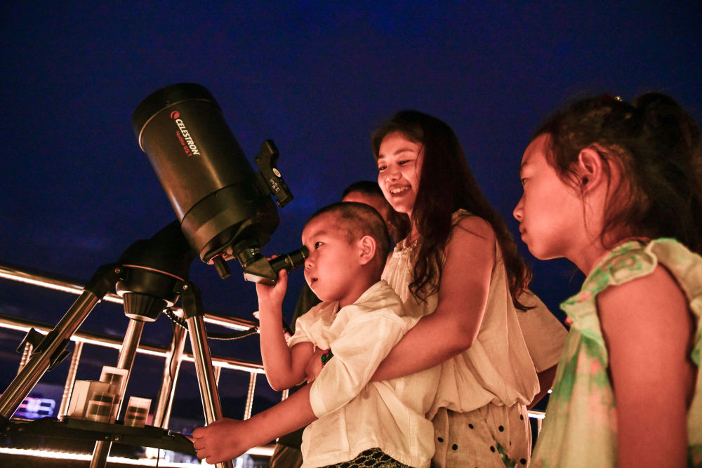 2025年7月9日,游客在贵州省平塘县克度“天文小镇”通过望远镜观测星空。近年来,随着旅游设施逐渐完善,距离“中国天眼”仅8公里的克度“天文小镇”通过“科普+文旅”发展模式,带动村民就业创业、增收致富。2025年1月至6月,“中国天眼”景区共接待游客约38万人次,总收入2496万余元。
