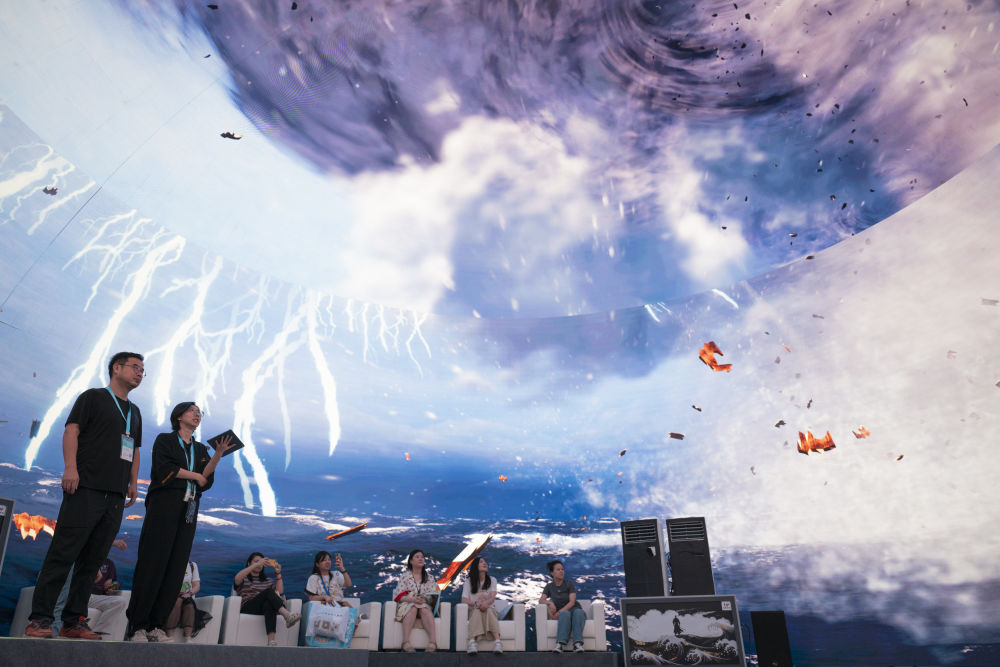2024年7月22日,游客在“寻境敦煌——数字敦煌沉浸展”借助VR设备沉浸式游览莫高窟第285窟虚拟场景。“寻境敦煌——数字敦煌沉浸展”综合运用VR虚拟现实、三维建模、游戏引擎的物理渲染和全局动态光照等新技术,高精度立体还原了莫高窟第285窟。游客戴上VR眼镜,不仅可以零距离观赏壁画、360度自由探索洞窟细节,还能“飞升”到窟顶,身临其境参与壁画故事情节,沉浸式感受敦煌文化的魅力。