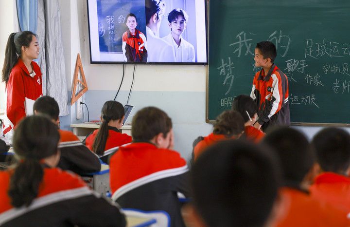 新疆克孜勒苏柯尔克孜自治州阿图什市哈拉峻乡谢依特小学,是一所主要面向柯尔克孜族学生的村级小学,2022年8月成为该州首个西部计划志愿者包校支教的试点学校。23名戍边支教西部计划志愿者服务队的志愿者,在这所小学承担着教书育人的工作。经过近三年的支教服务,学生的学习成绩显著提高,得到当地广泛认可。这是2025年4月23日,支教教师高淑贤(左一)在班级里展示她为学生们制作的“AI梦想职业照”。