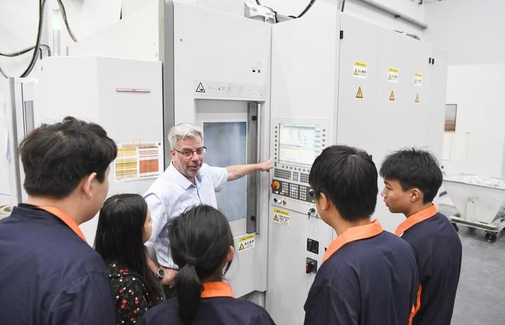 2024年4月16日,在位于重庆市永川区中德产业园的埃斯维(重庆)机床有限公司,公司技术总监向重庆城市职业学院中德产业学院学生介绍设备操作规范。近年来,重庆城市职业学院联合德国教育力量共建产业学院,引入职业教育先进经验,着力培养适合制造型企业需求的高素质技能技术人才。