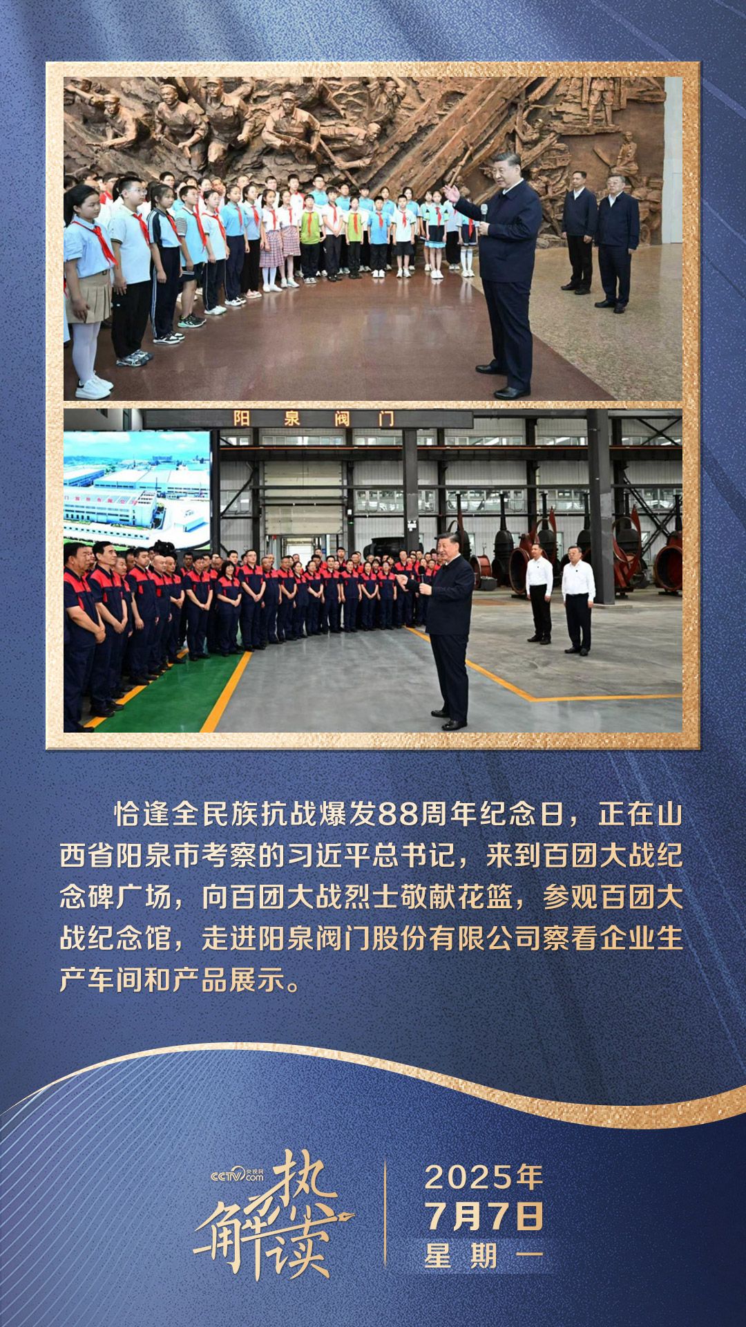 恰逢全民族抗战爆发88周年纪念日,习近平总书记踏上阳泉这片红色热土,先后来到百团大战纪念馆、阳泉阀门股份有限公司考察。特殊的时间节点、特别的考察地点,带来特殊的重要意义。