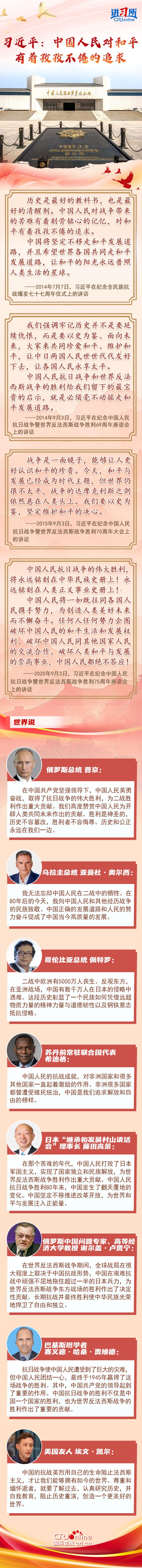 “中国人民抗日战争和世界反法西斯战争的胜利给我们留下的最宝贵的启示,就是必须毫不动摇走和平发展道路。”作为世界上唯一将和平发展写入宪法和执政党党章、上升为国家意志的大国,中国始终从历史中汲取智慧和力量,坚定捍卫来之不易的胜利成果。在国际友好人士眼中,中国为世界反法西斯战争东方战场的胜利作出了决定性贡献,中国正确的发展道路和人民的努力奋斗促成了中国当今高质量的发展,为世界和平与发展注入正能量。