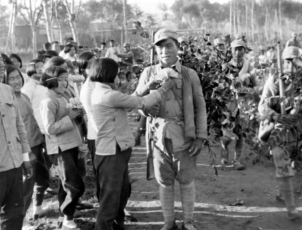 这是老百姓为百团大战胜利归来的英雄佩戴光荣花(中国照片档案馆馆藏)。