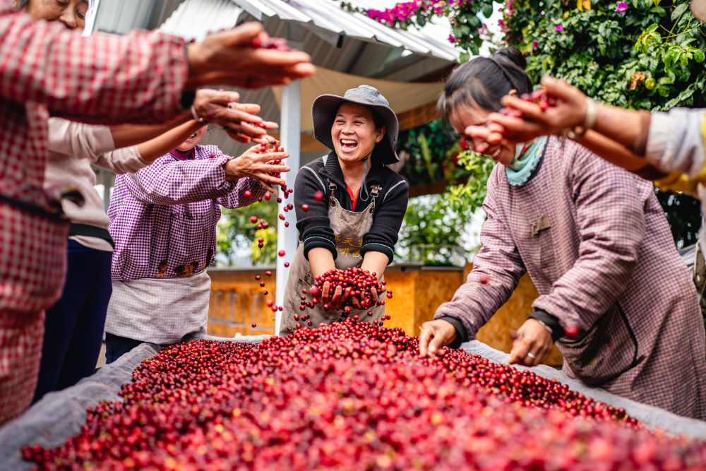 在云南省普洱市思茅区天玉咖啡庄园,庄园经营者玉吨(中)和工作人员庆祝咖啡丰收(2025年1月8日摄)。
