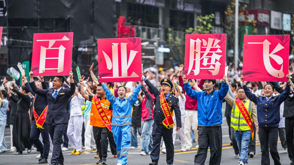 这是奋斗之光方阵的表演队伍在进行巡游。新华社记者 陶亮 摄
