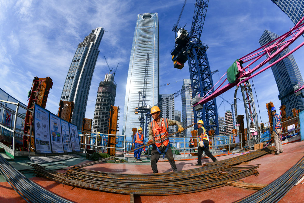 2024年10月3日,中建五局的建设者在深圳湾超级总部基地C塔项目建设现场施工。新华社记者 梁旭 摄