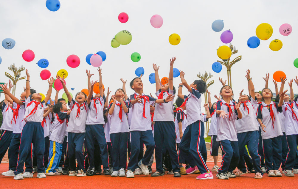 2024年5月8日,在湖南省永州市道县第二小学,学生放飞笑脸气球。新华社发(蒋克青 摄)