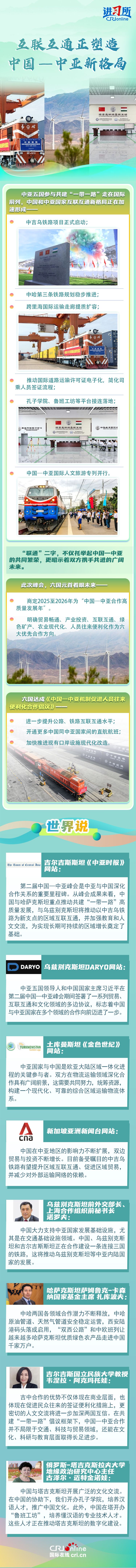 国际舆论及中亚各界人士认为,中国和中亚国家互联互通新格局有利于中亚国家提升自主发展能力,特别是在共建“一带一路”倡议框架下,中国—中亚合作在贸易、人文等多领域取得了长足进步,为区域实现长期可持续增长奠定了基础。