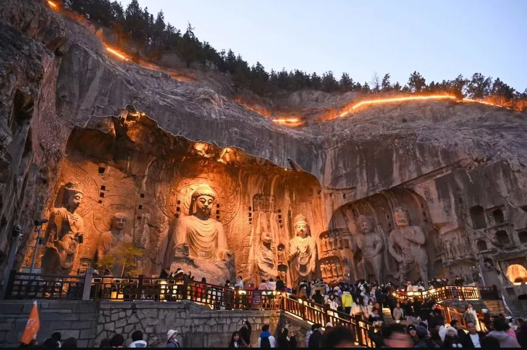 天天学习 洛阳城南,伊水汤汤。2345个窟龛、近11万尊石刻造像、2800余块碑刻题记,以峭壁层阿为依托,在夹岸青山镌刻下沧桑的历史印记,这就是洛阳龙门石窟。