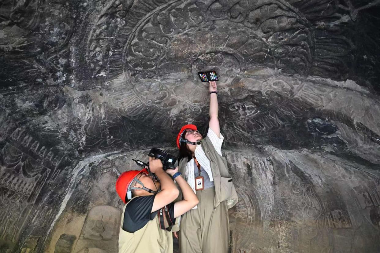 4月10日,龙门石窟研究院工作人员(右)与武汉大学文化遗产智能计算实验室团队成员一同对龙门石窟魏字洞进行高清摄影扫描。新华社记者 李嘉南 摄